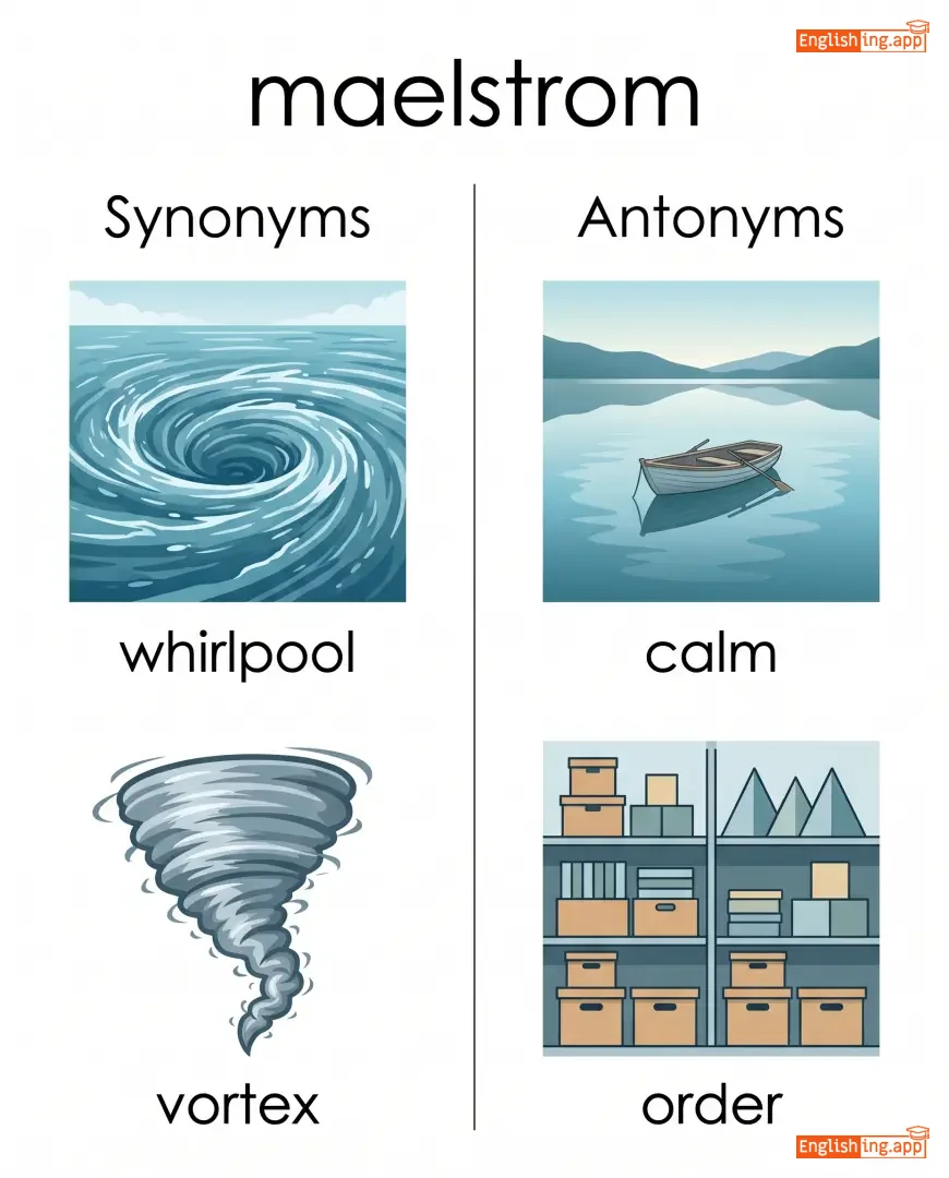 A powerful whirlpool in the sea or a situation of confused movement and turmoil.
