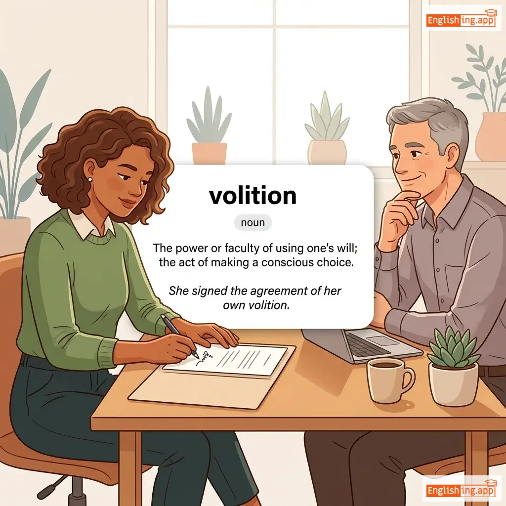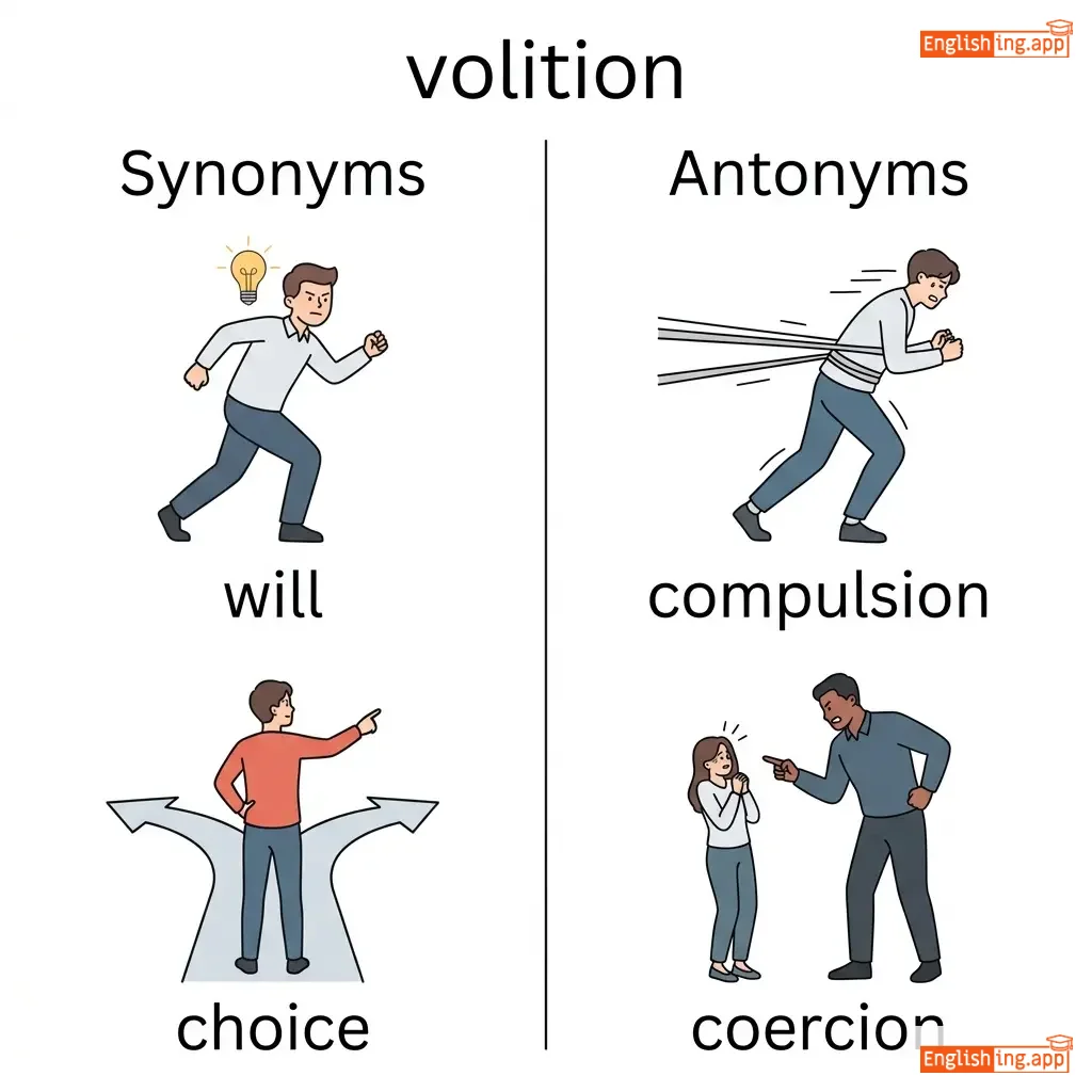 Volition in German means the power of choice, closely tied to 'Wille' meaning will.