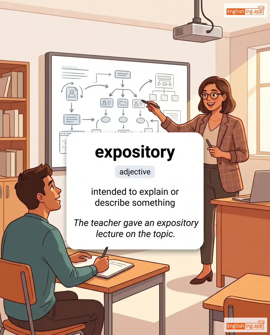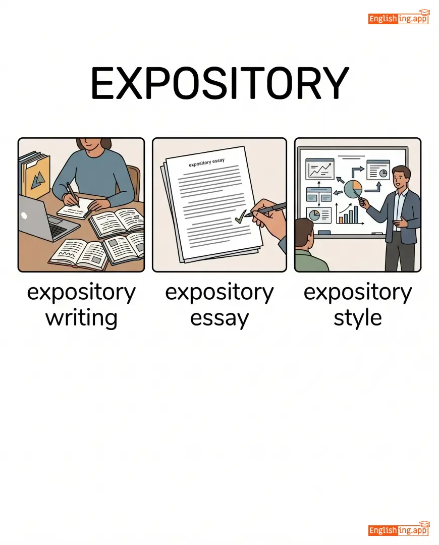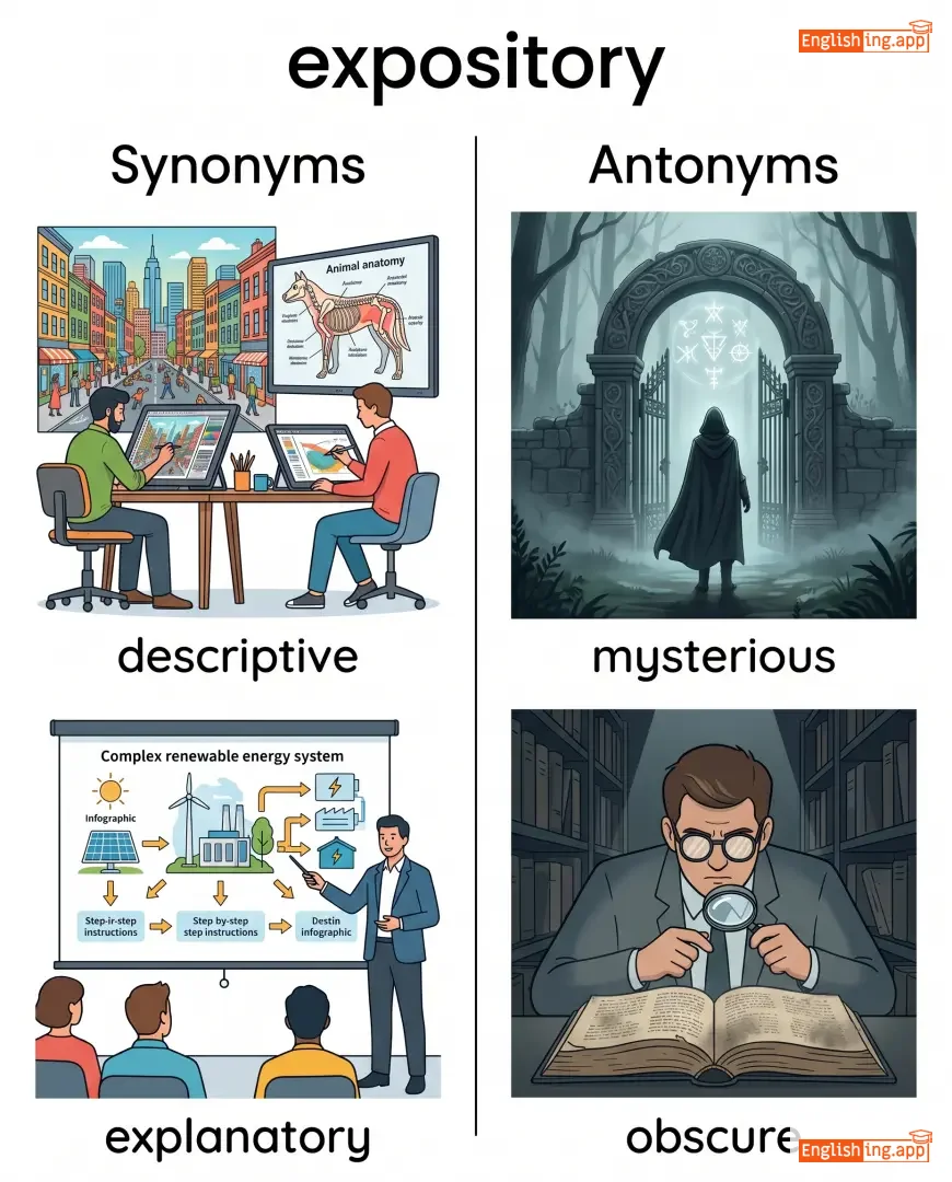Expository klingt wie 'erklären'—auf Deutsch bedeutet es 'erklärend'.