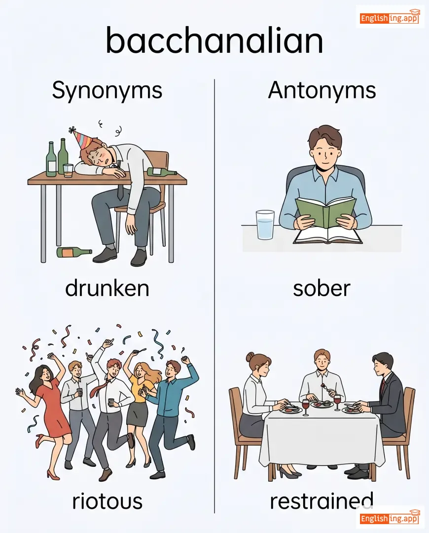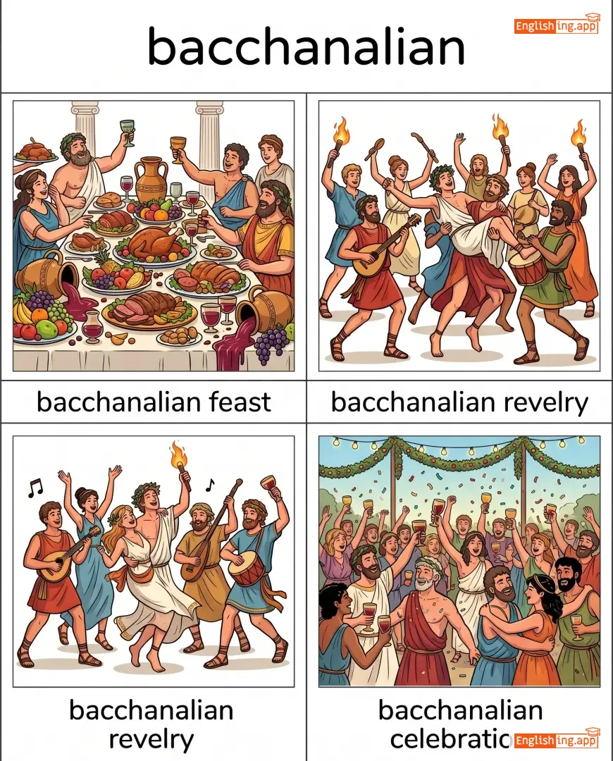 Bacchanalian bedeutet eine ausgelassene, betrunkene Feier wie bei Bacchus.