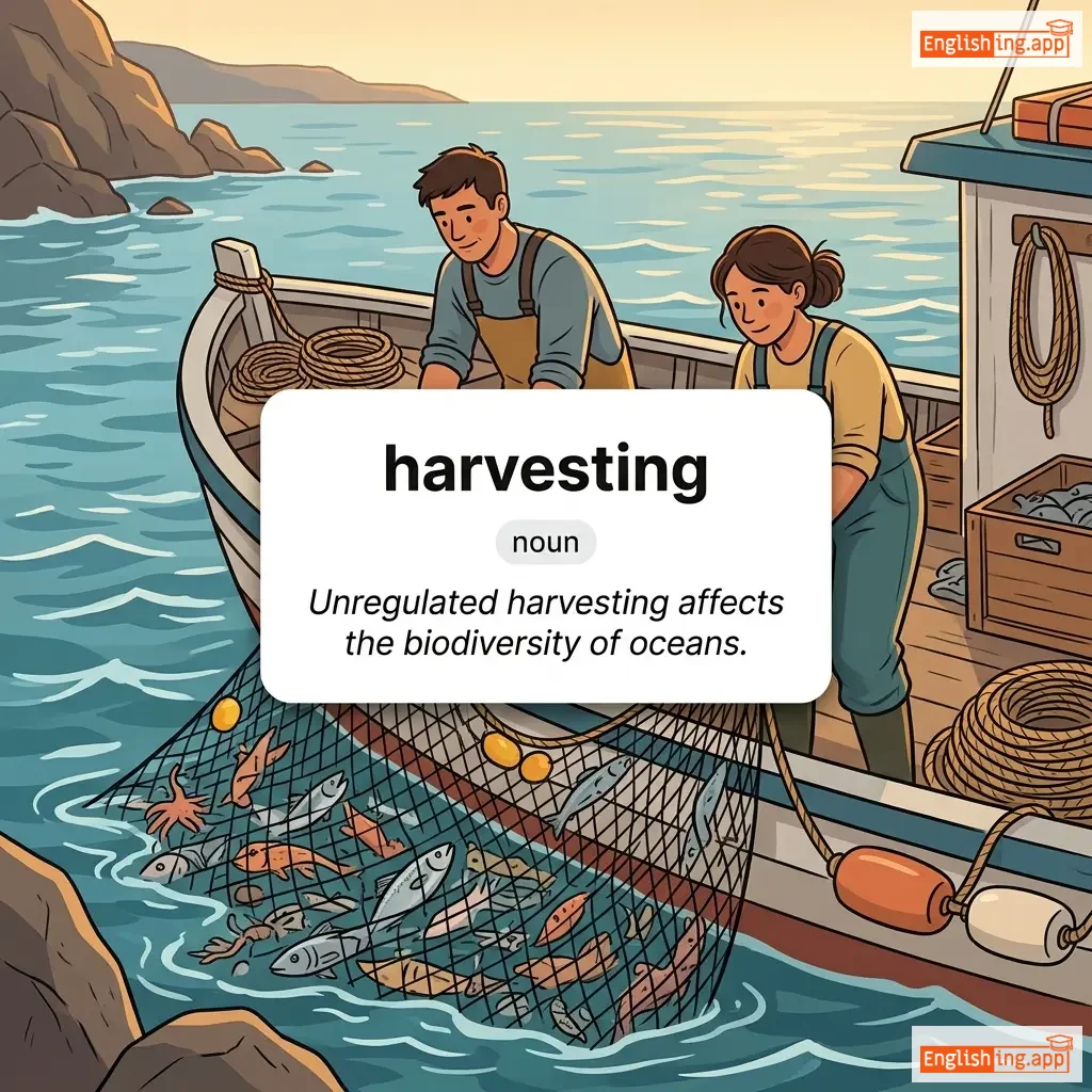 The process of gathering a ripe crop from the fields or collecting natural resources.