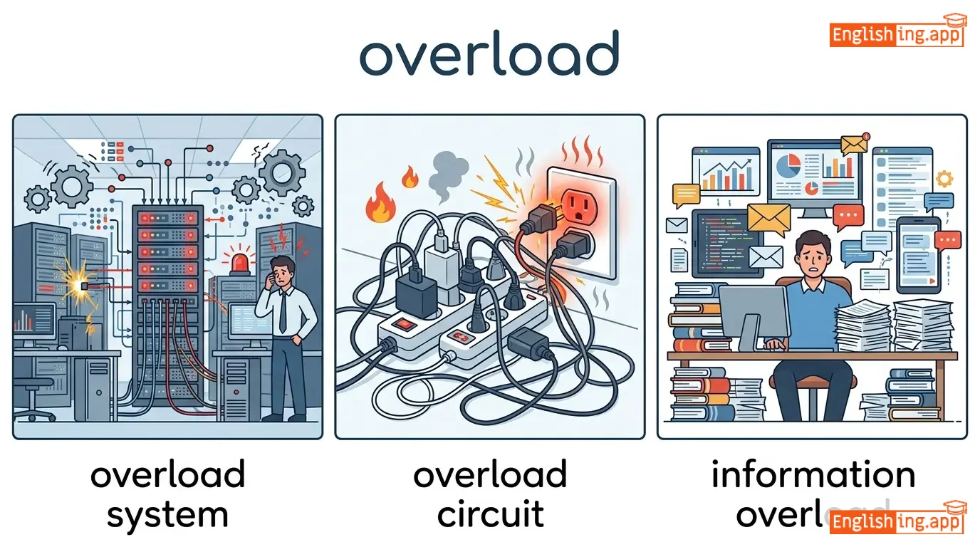 bahut adhik wajan ya maal se load karna; bahut adhik kaam ya jaankari dena