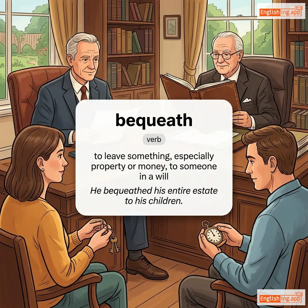 Leave something to someone in a will; pass down or hand down to the next generation.
