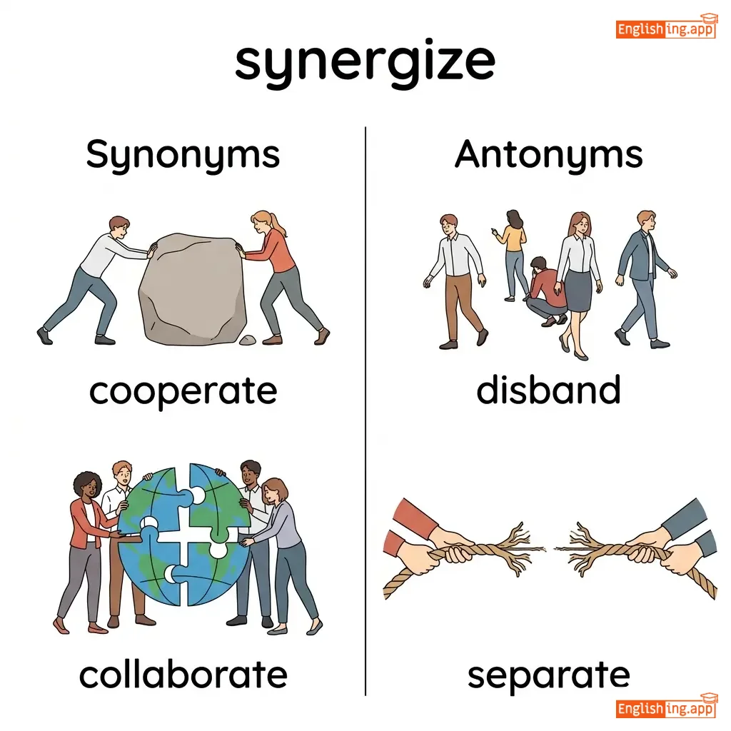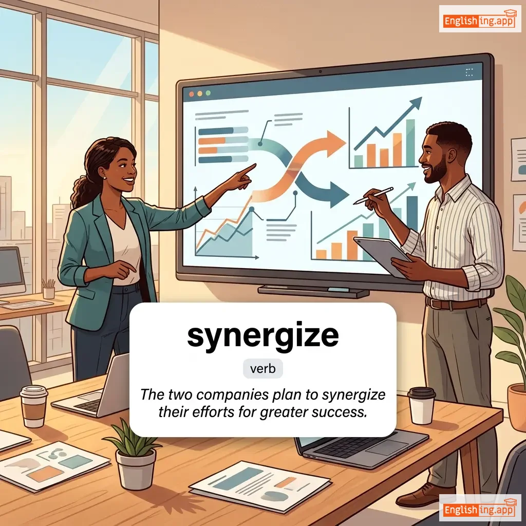 To combine in such a way that the total effect is greater than the sum of the individual effects; to work together cooperatively.