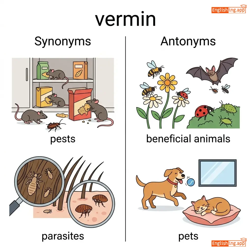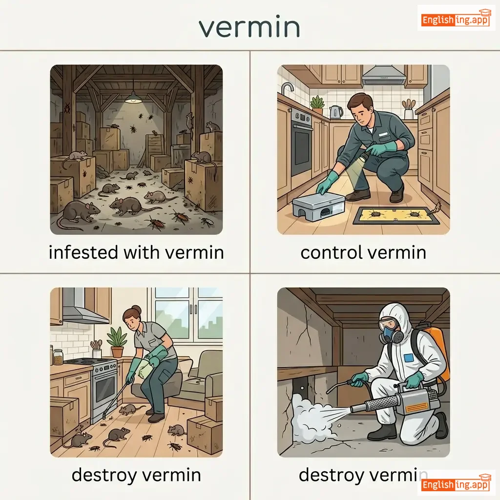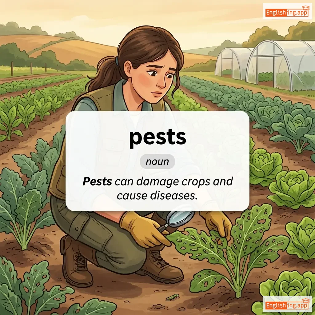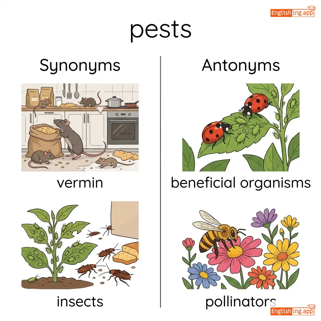 Harmful or troublesome creatures, especially insects or small animals that damage crops, food, or living spaces.