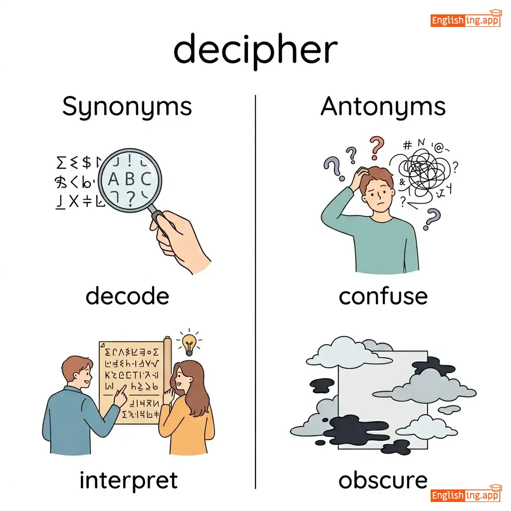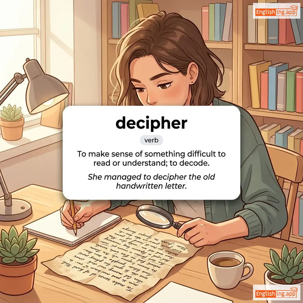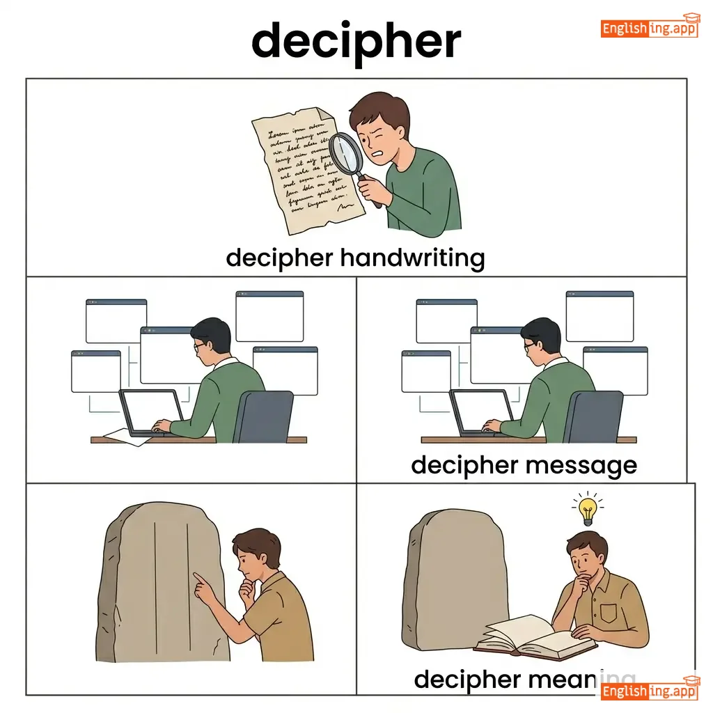 To convert something written in code into normal language; to succeed in understanding the meaning of something.