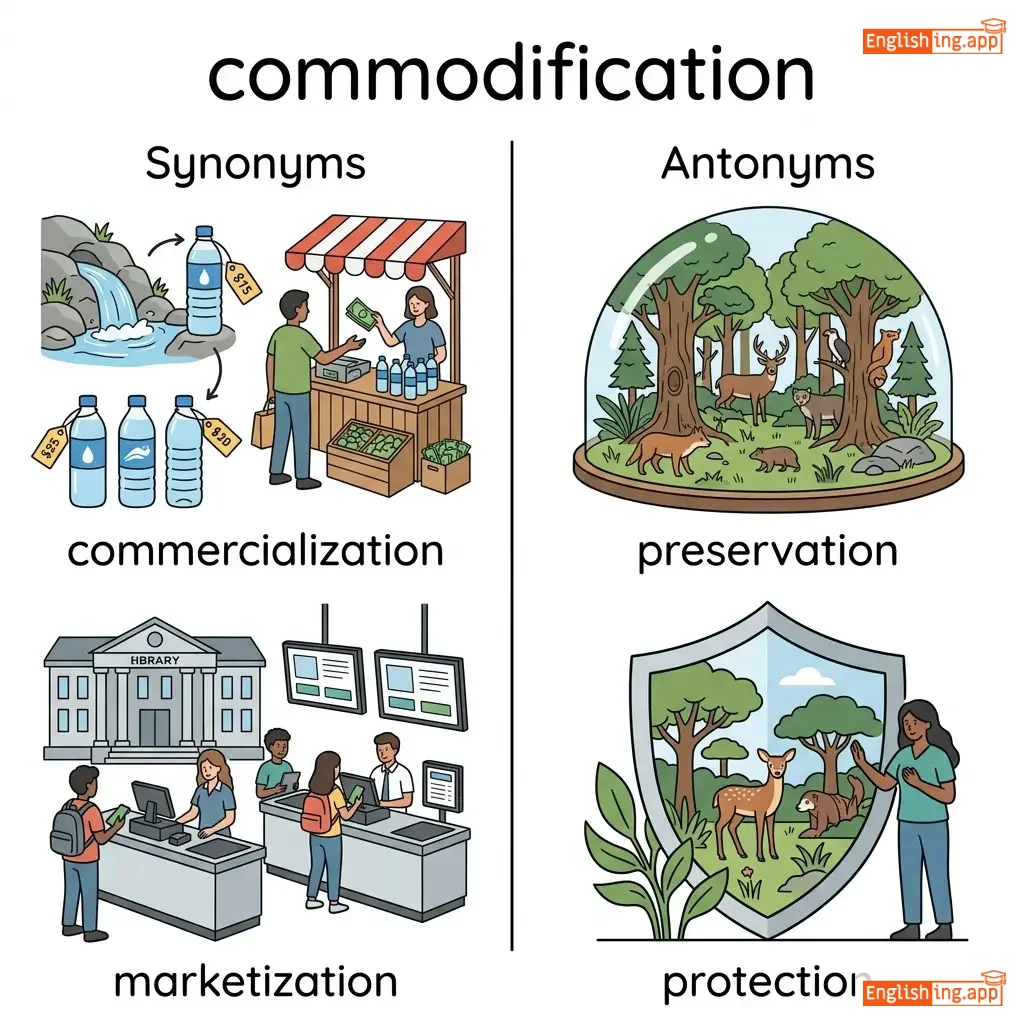The transformation of goods, services, ideas, or social relations into market commodities.