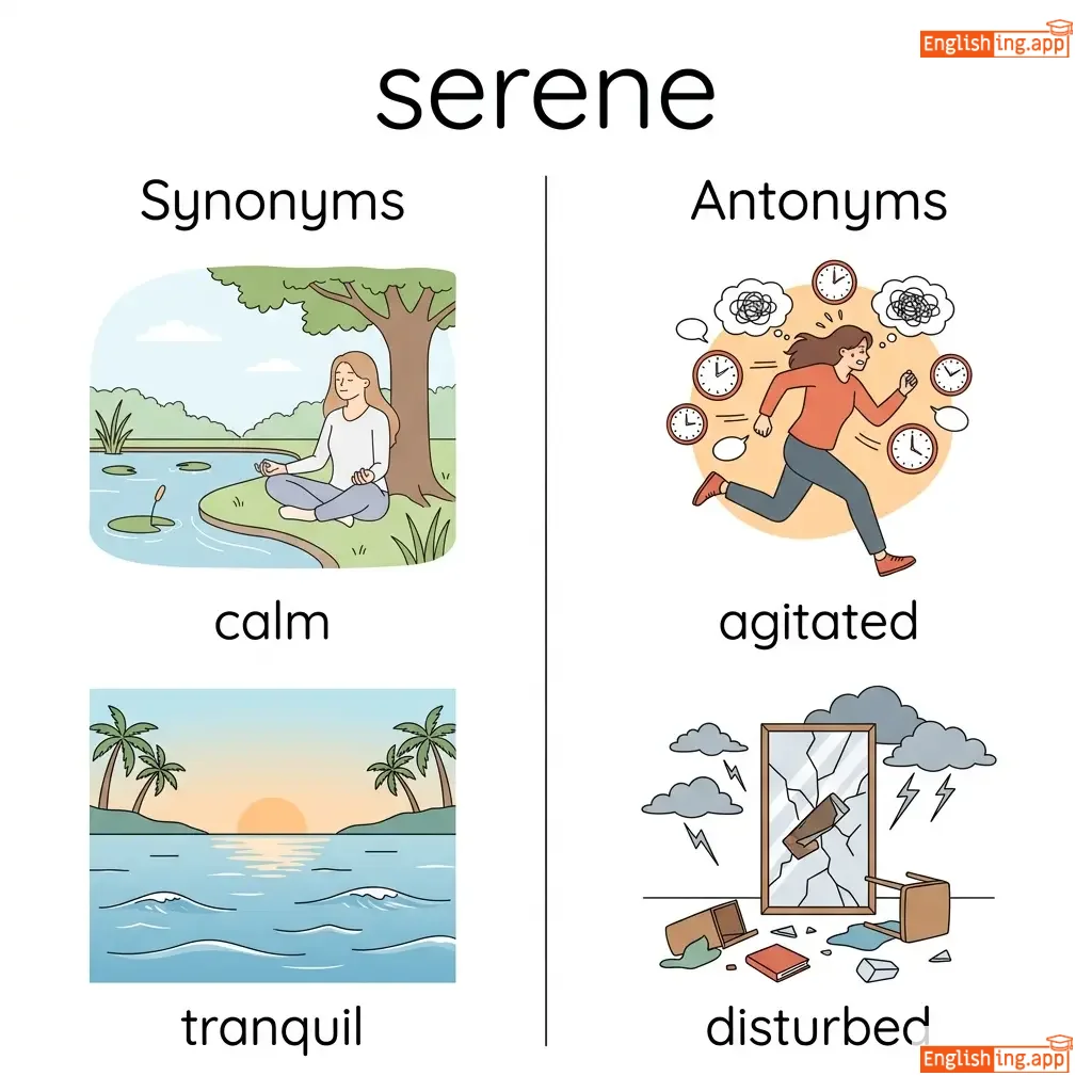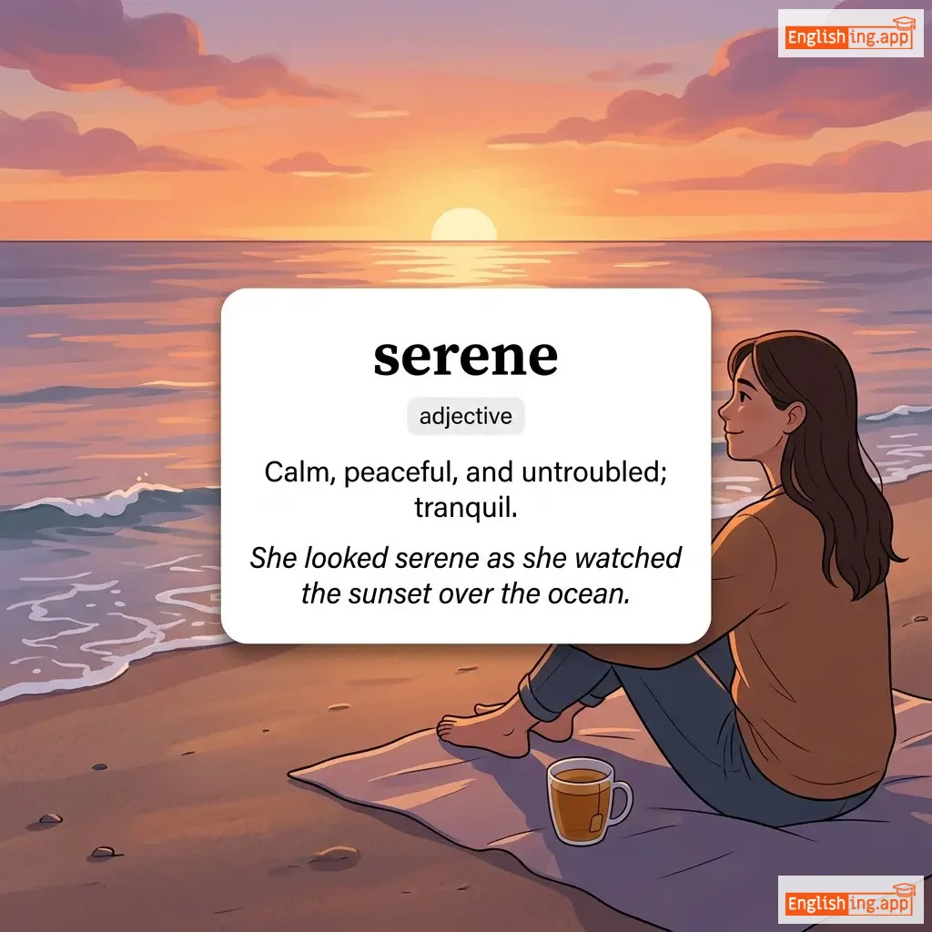 Calm, peaceful, and untroubled; tranquil.
