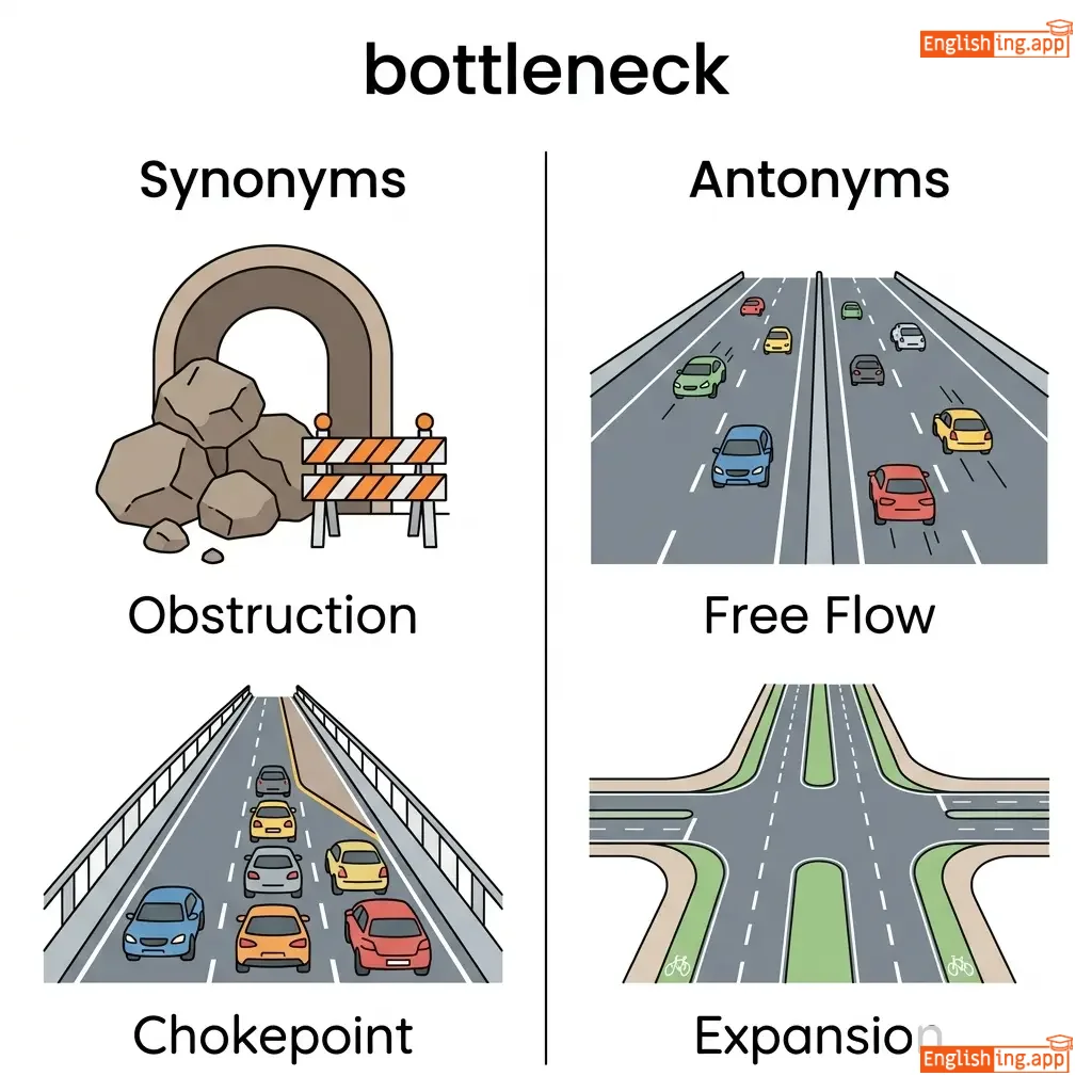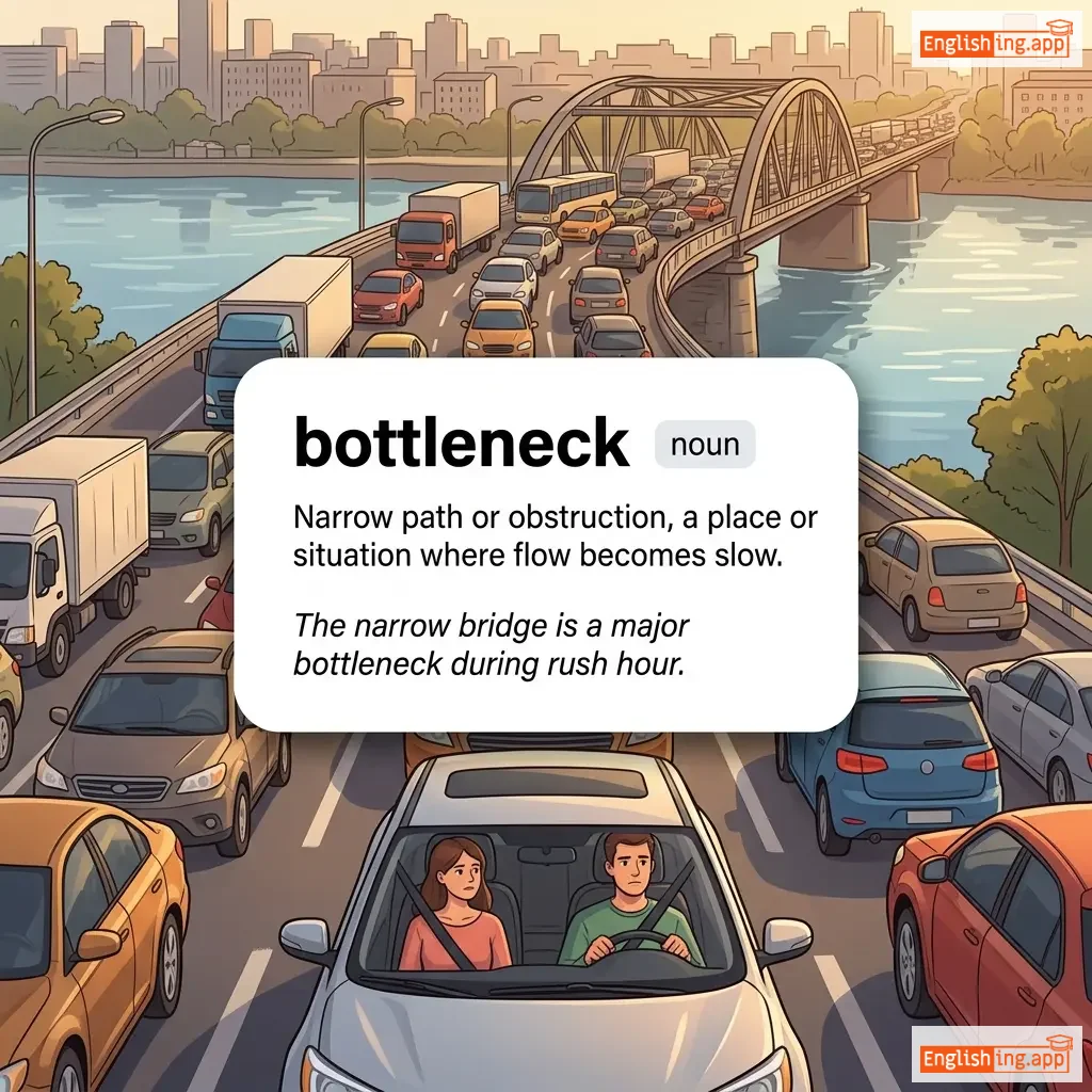 Narrow path or obstruction, a place or situation where flow becomes slow.