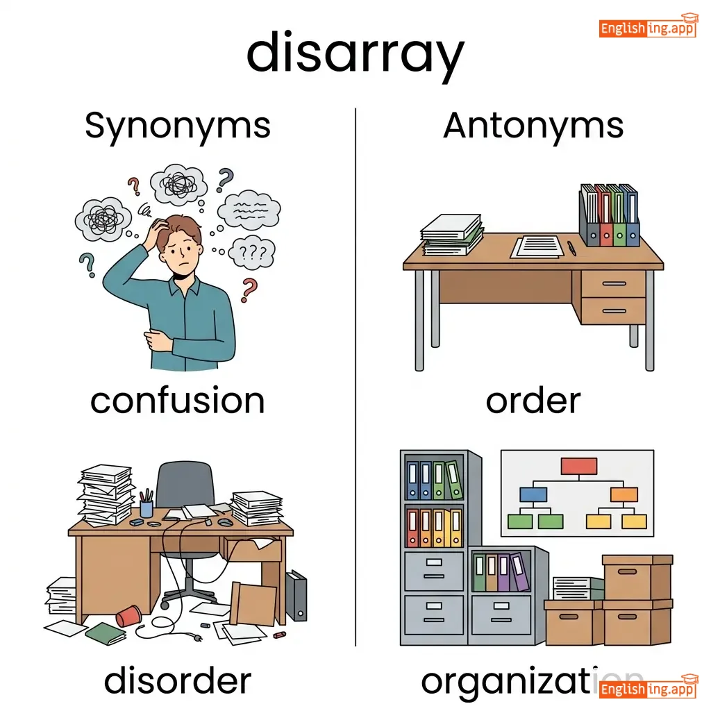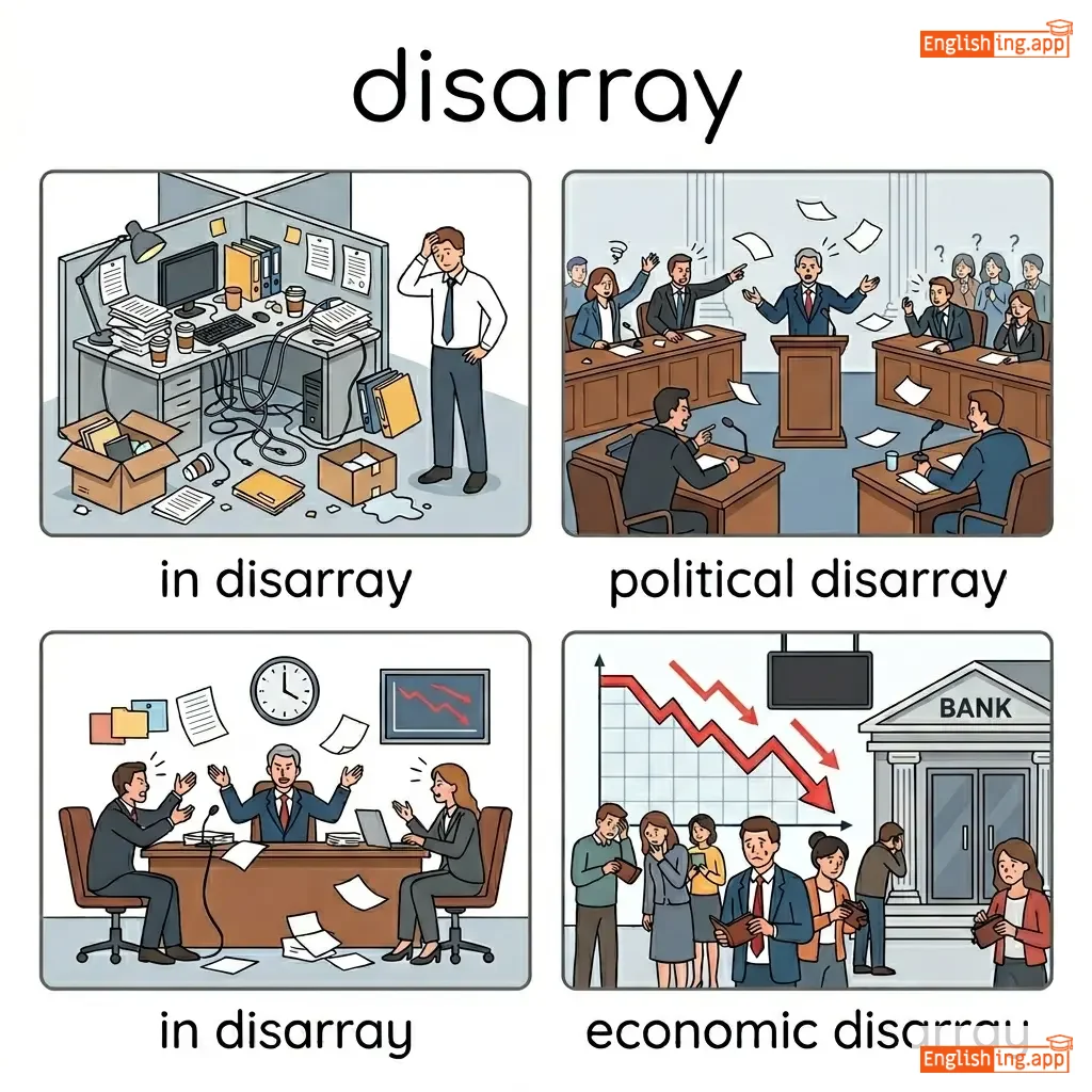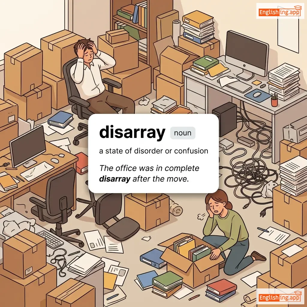 A state of disorganization or untidiness; confusion or disorder.