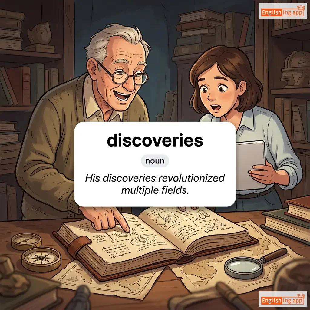 inventions, findings, revelations, breakthroughs, explorations, detections