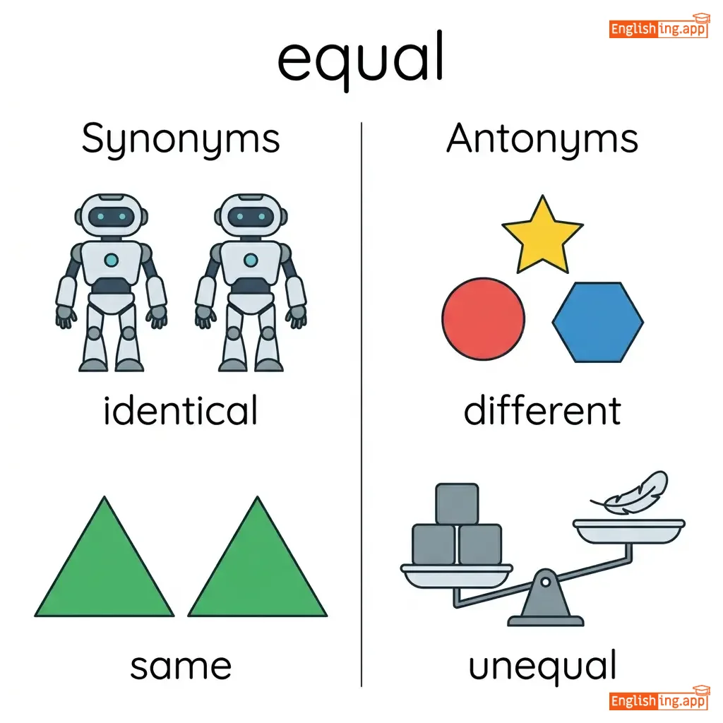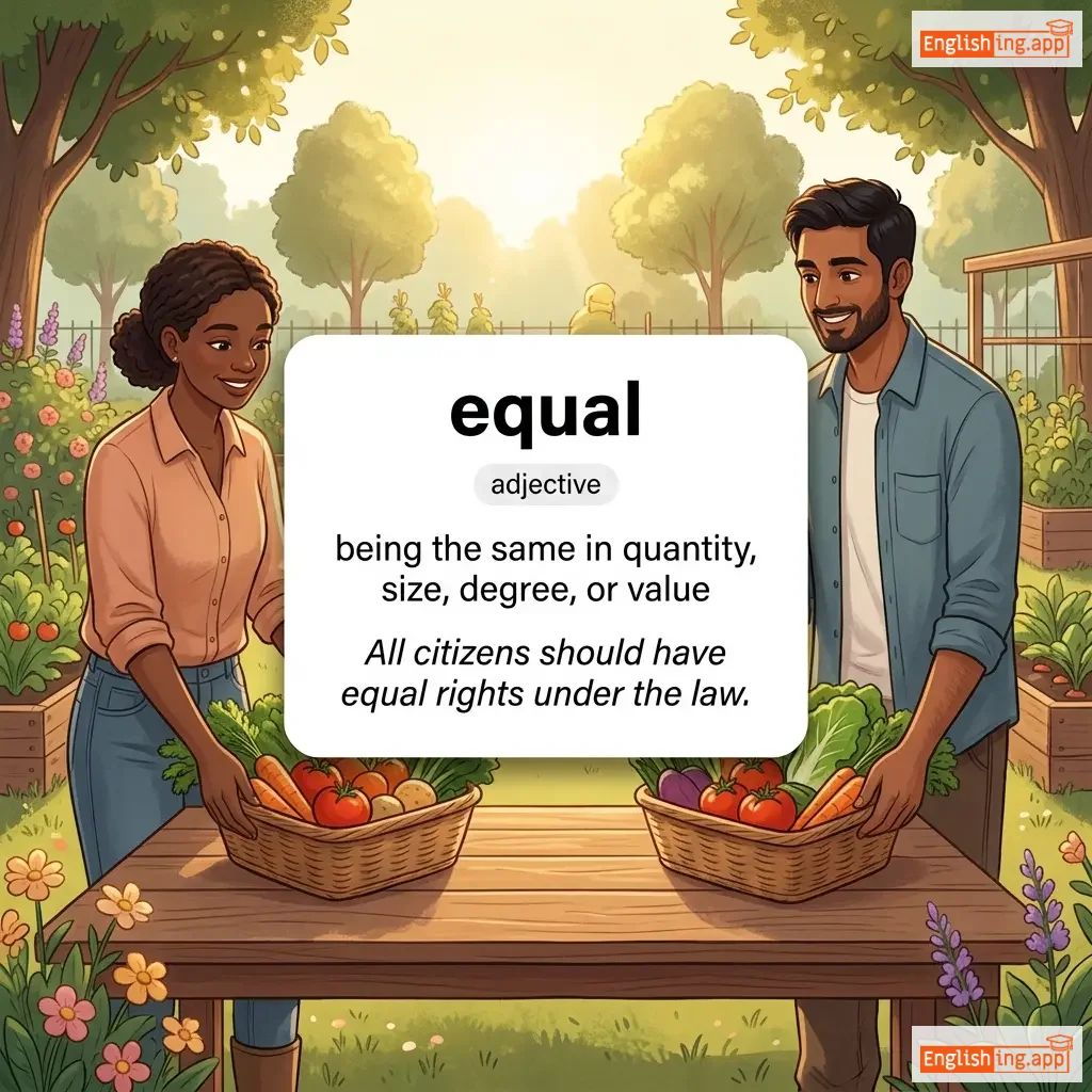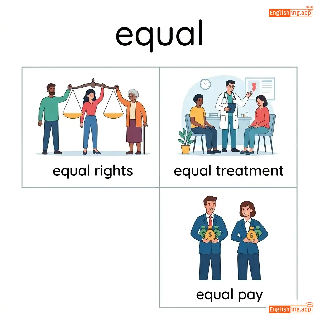Being the same in quantity, size, degree, or value; having the same status or treatment.