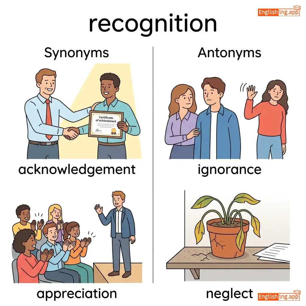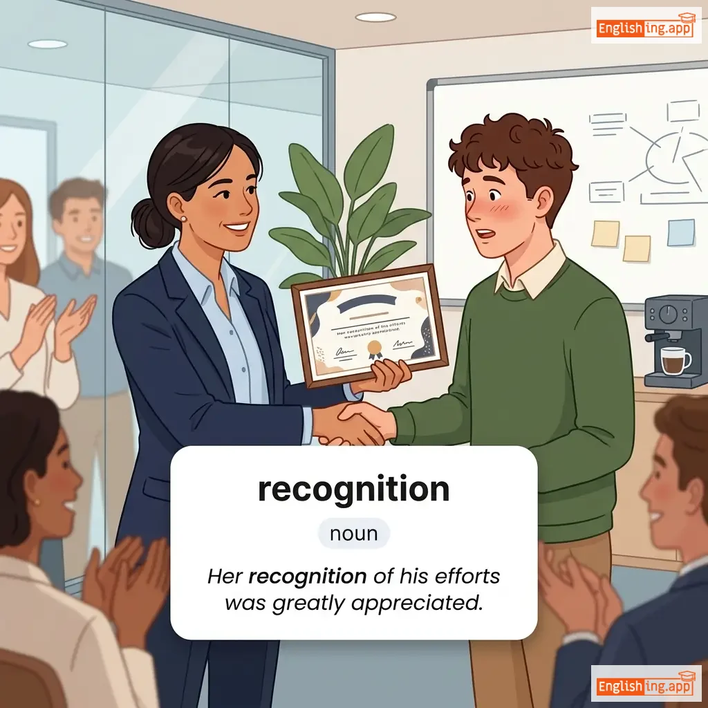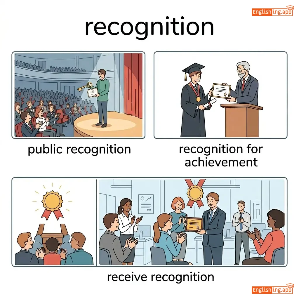 Acknowledgment of the existence, validity, or legality of something; appreciation or acclaim for an achievement, service, or ability.