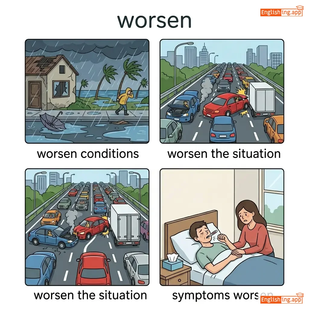 To make or become worse; to deteriorate in quality, condition, or degree.