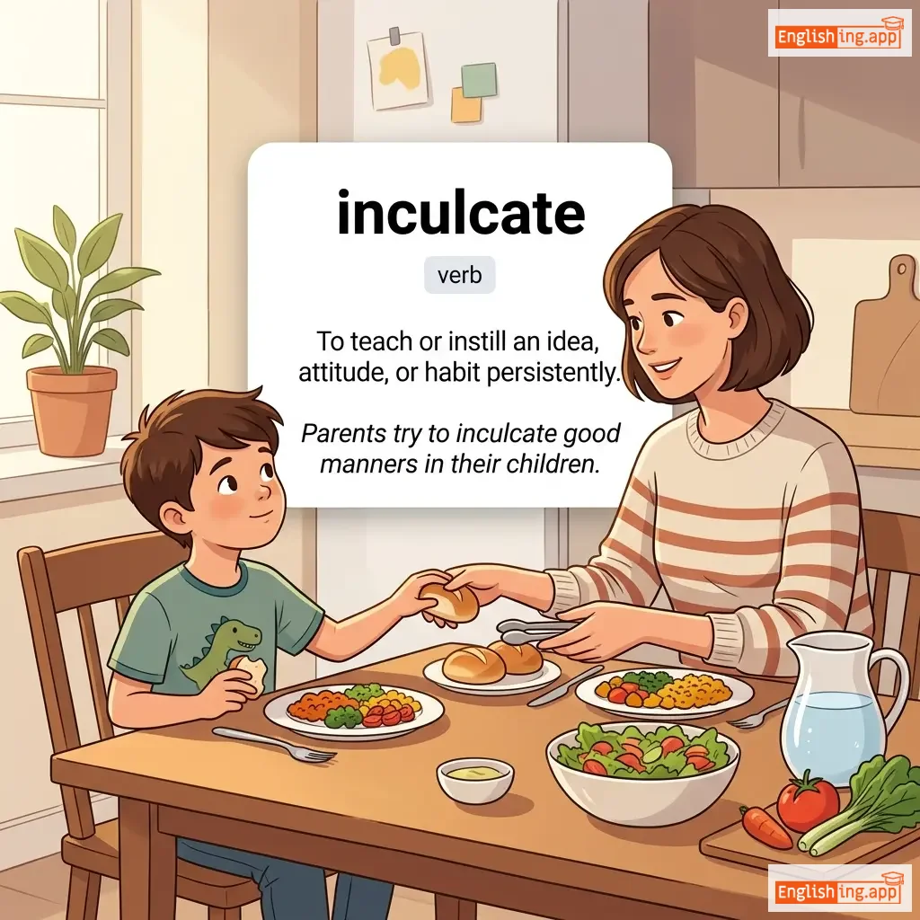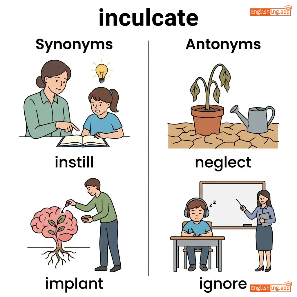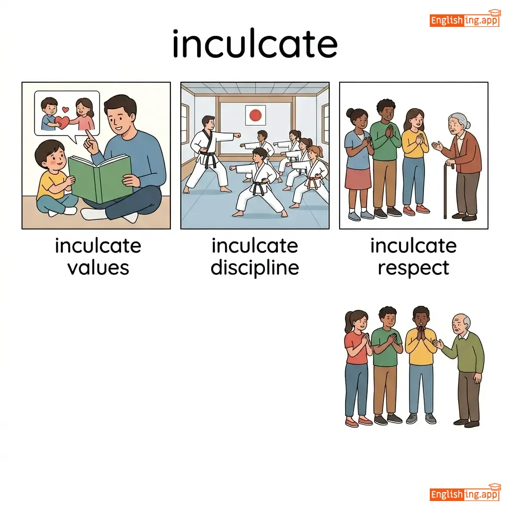 Instill an attitude, idea, or habit by persistent instruction; to teach and impress by frequent repetitions.