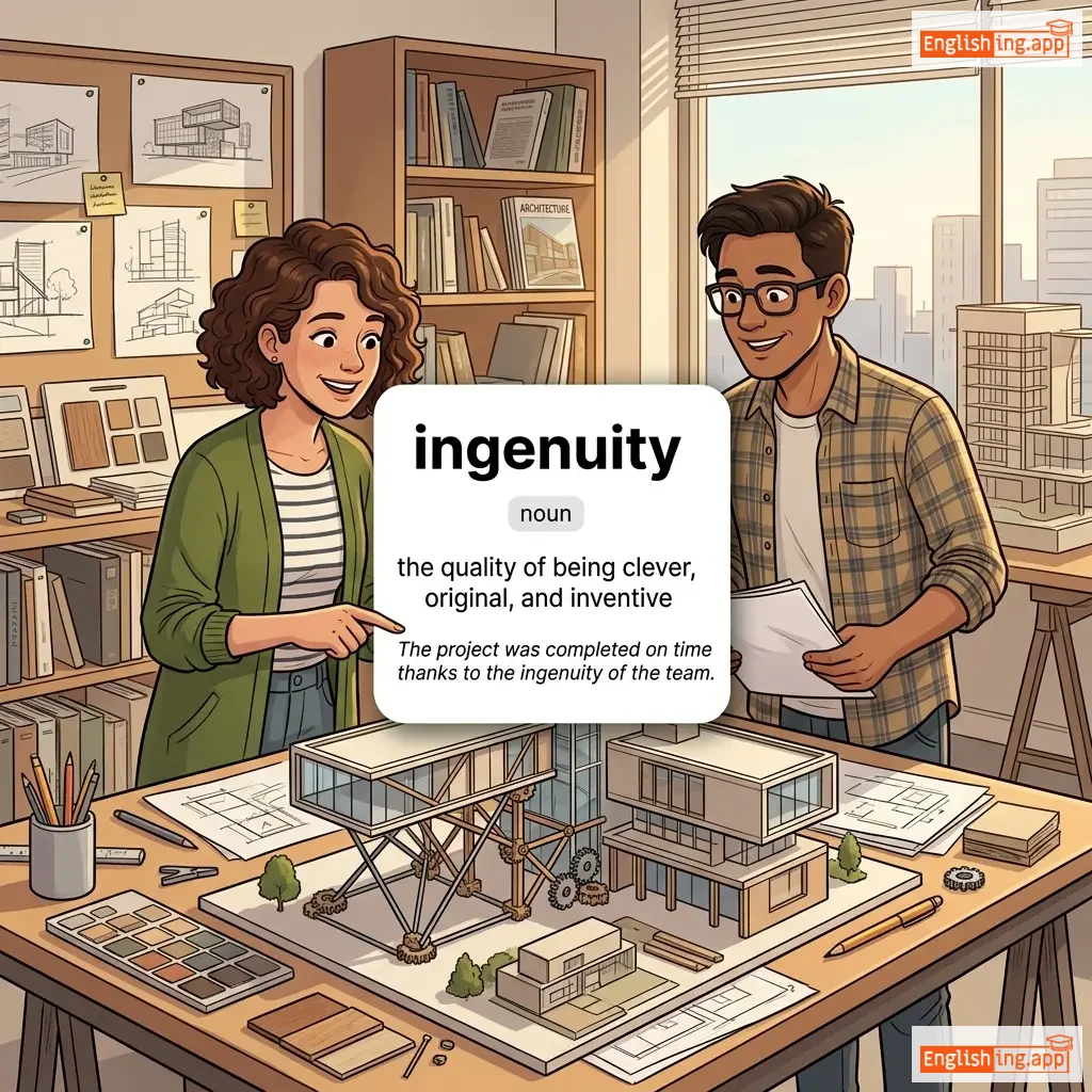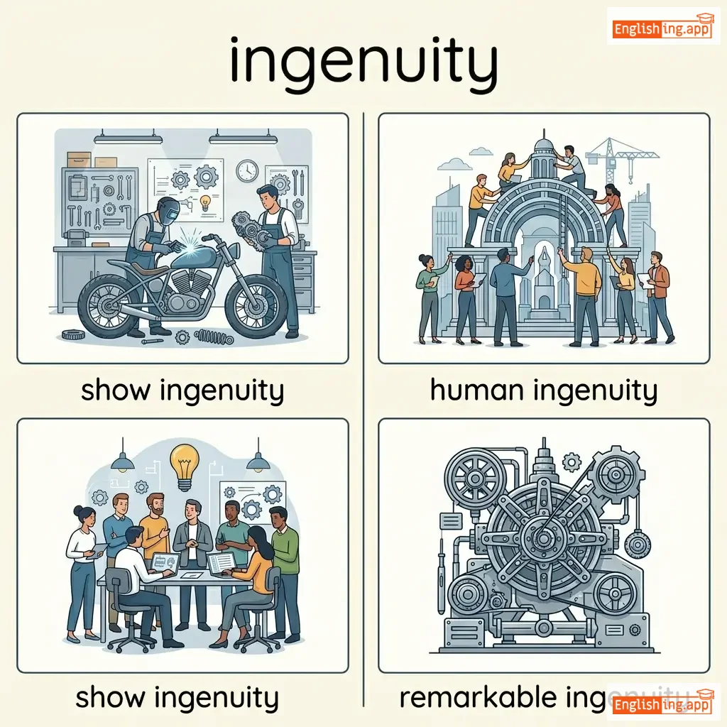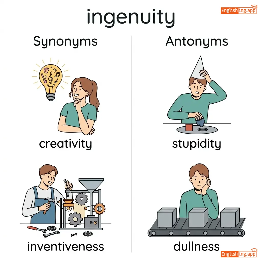 The quality of being clever, original, and inventive; creative problem-solving ability.