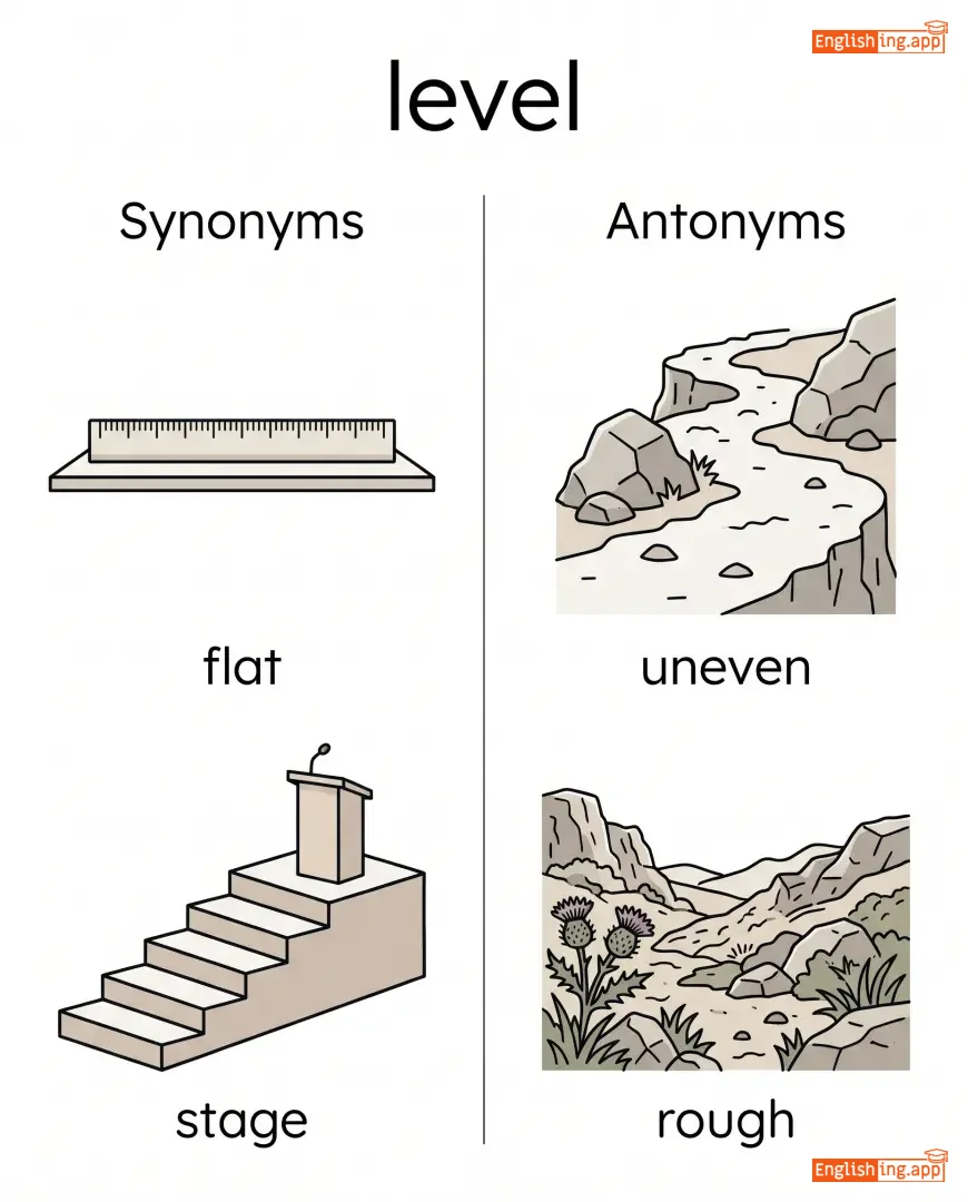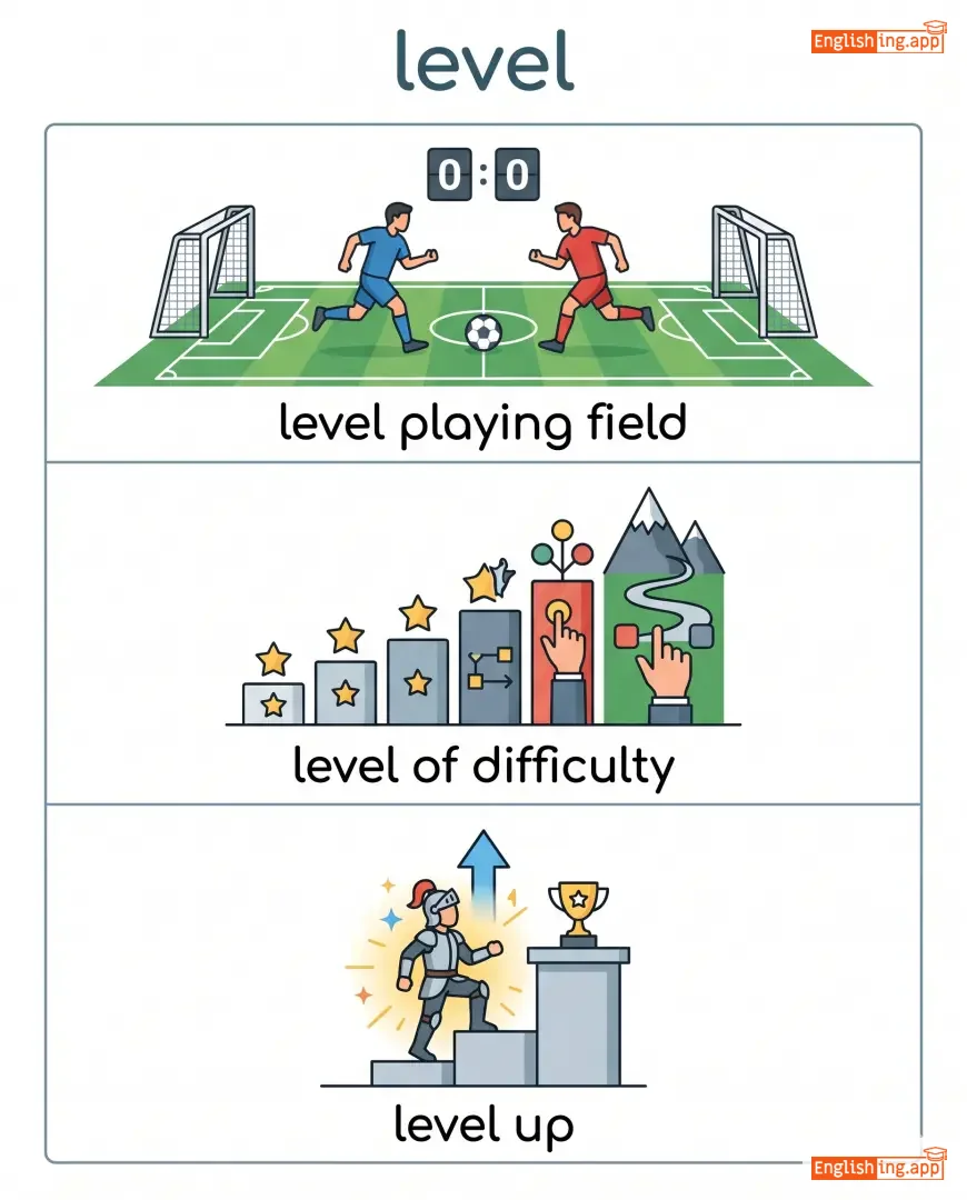 level playing field, level of difficulty, level up, level surface
