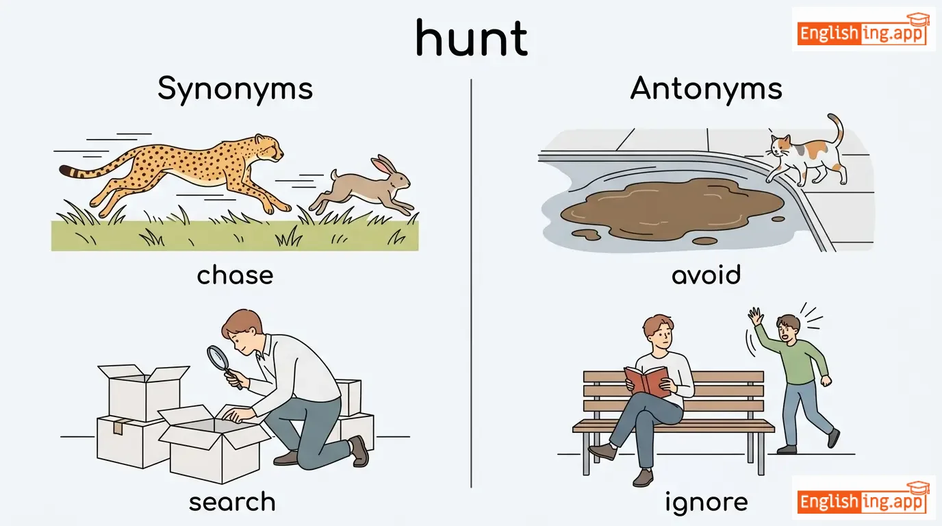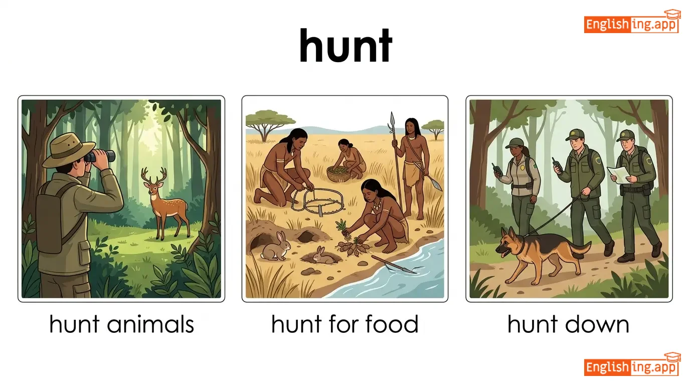 hunt animals, hunt for food, hunt down, go hunting
