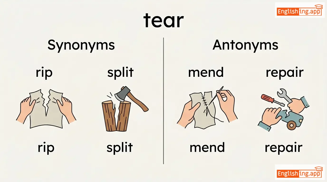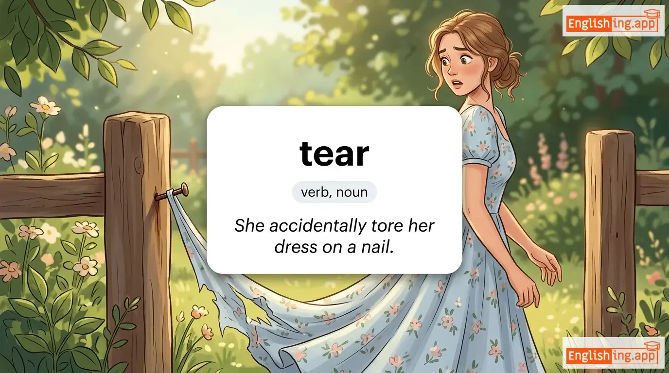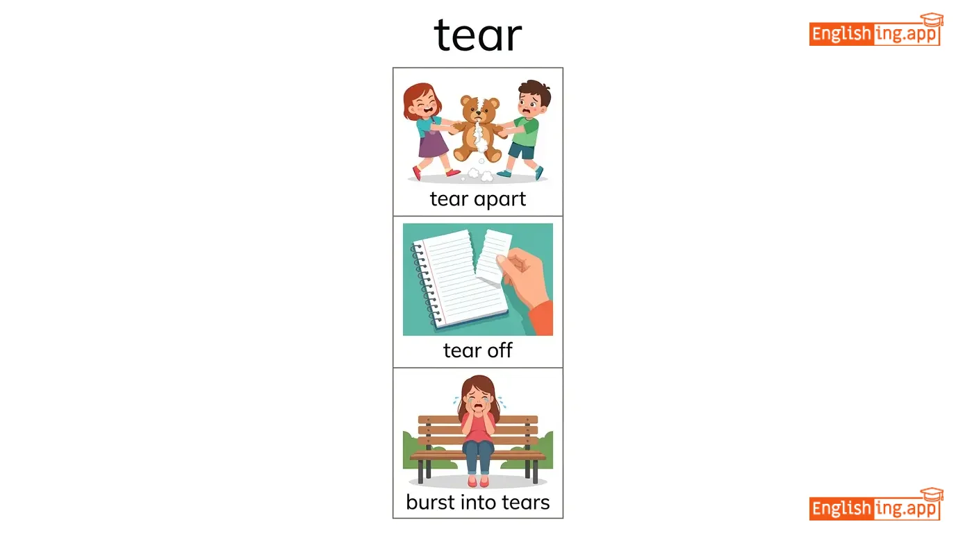 As a verb: to pull apart or rip something. As a noun: a drop of clear salty liquid produced by glands in your eyes.