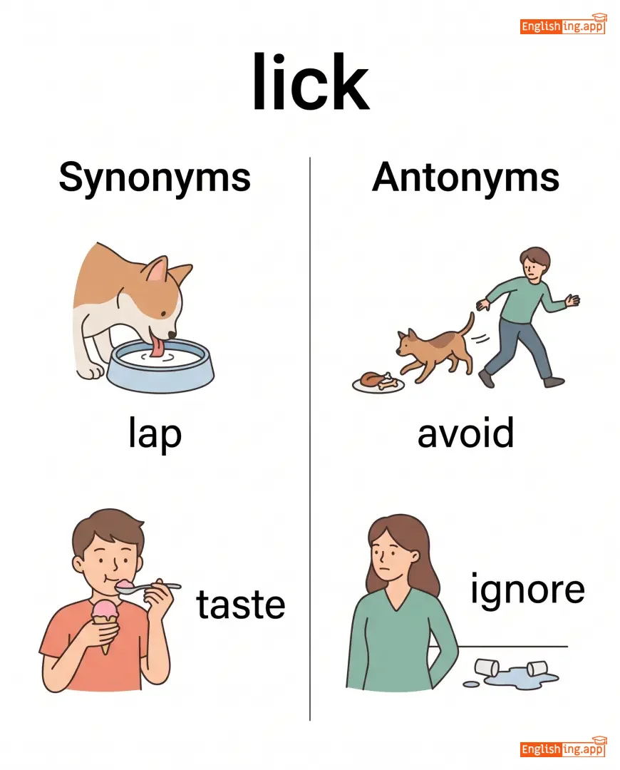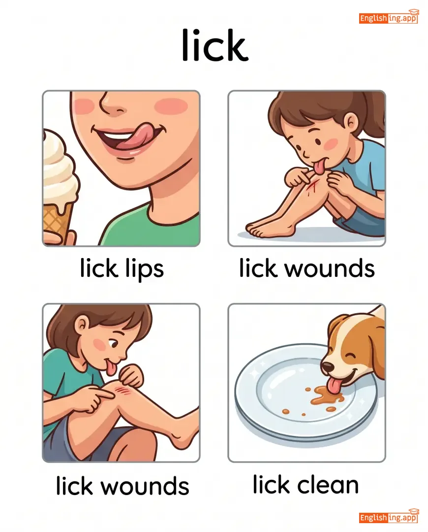 lick lips, lick wounds, lick clean, lick stamps, lick ice cream