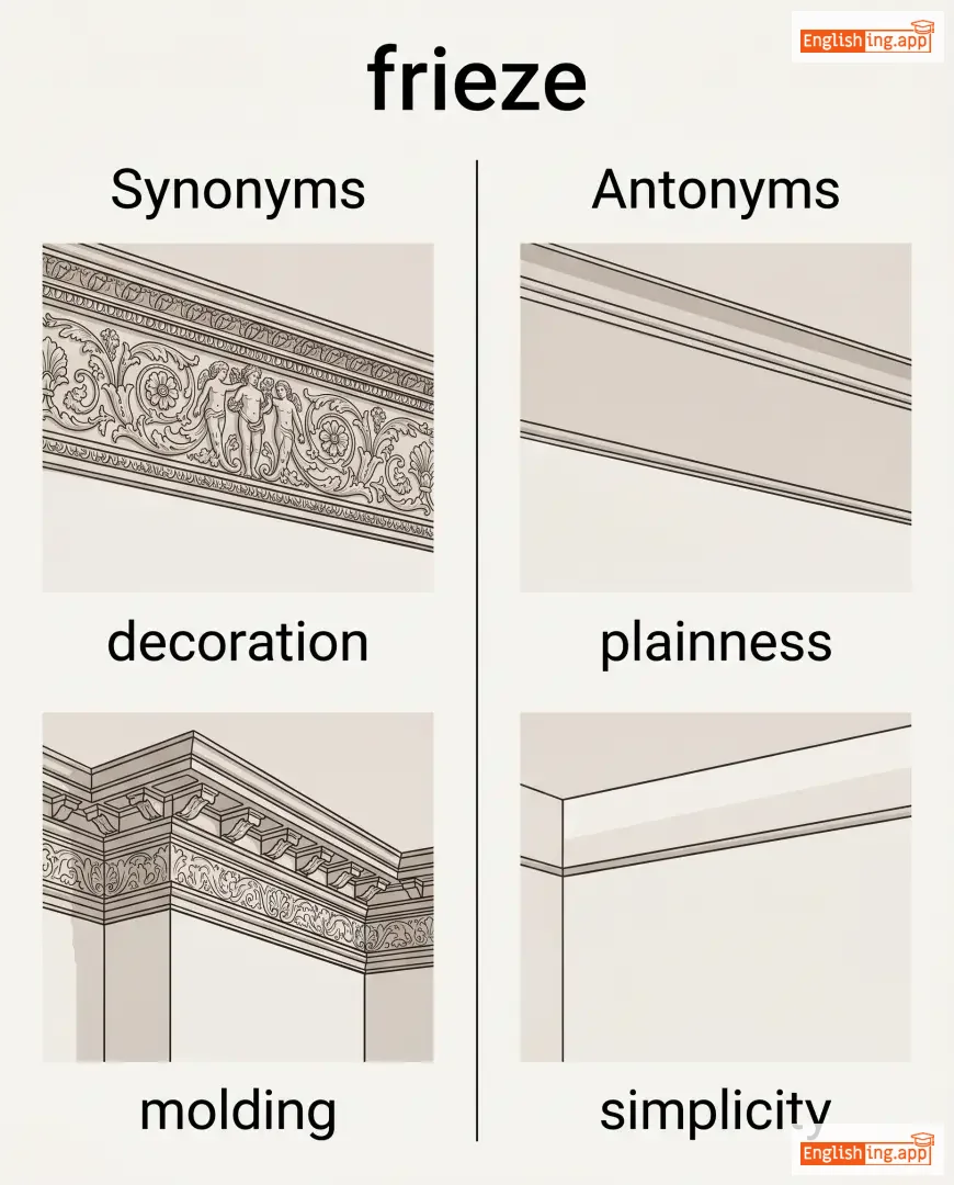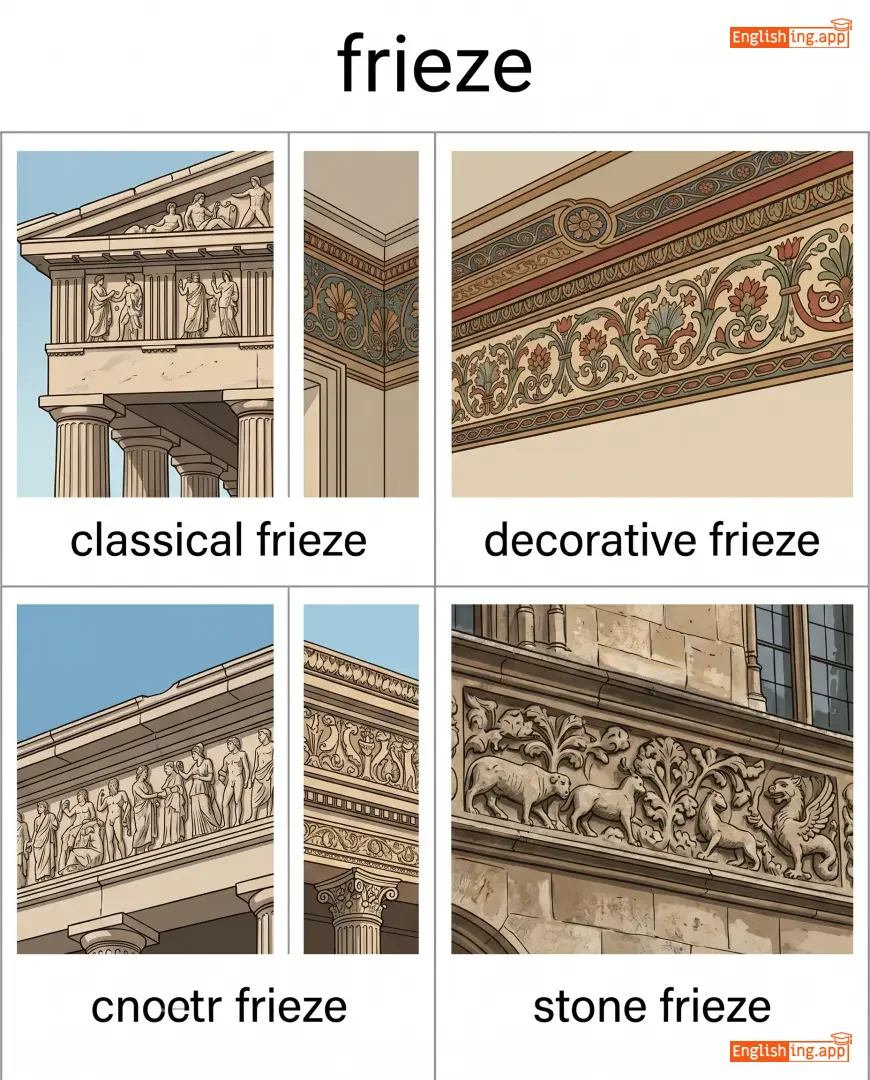 a decorative horizontal band, often sculpted or painted, usually on a wall near the ceiling