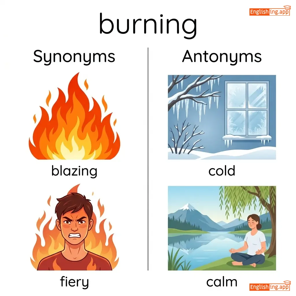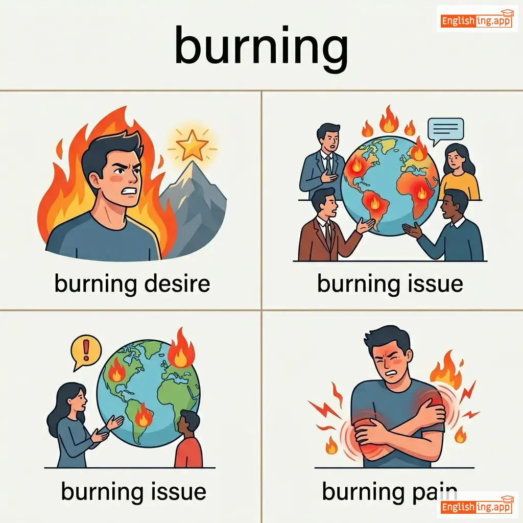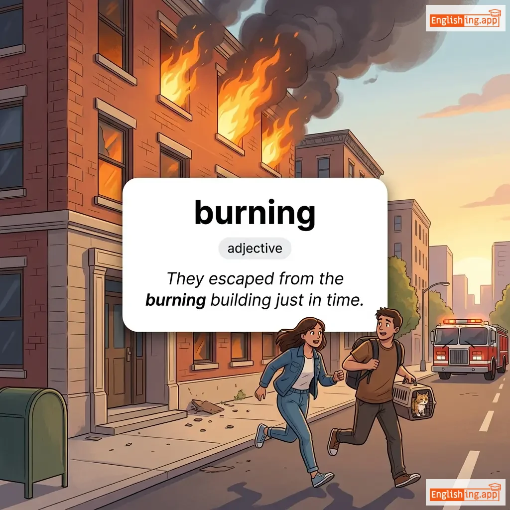 producing flames or intense heat; also used metaphorically for intense emotions or urgency
