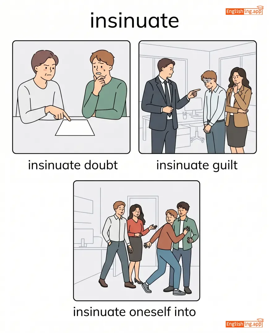 insinuate doubt, insinuate guilt, insinuate oneself into