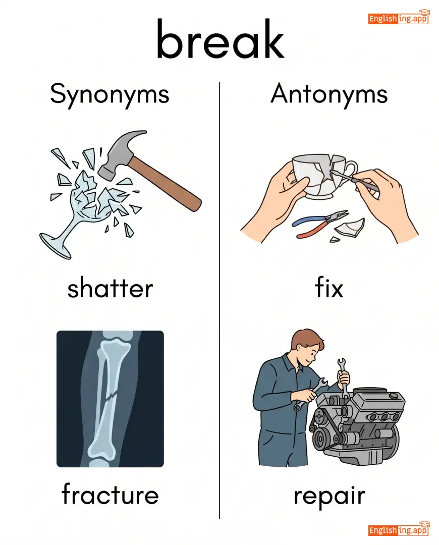 shatter, fracture, smash, pause, recess