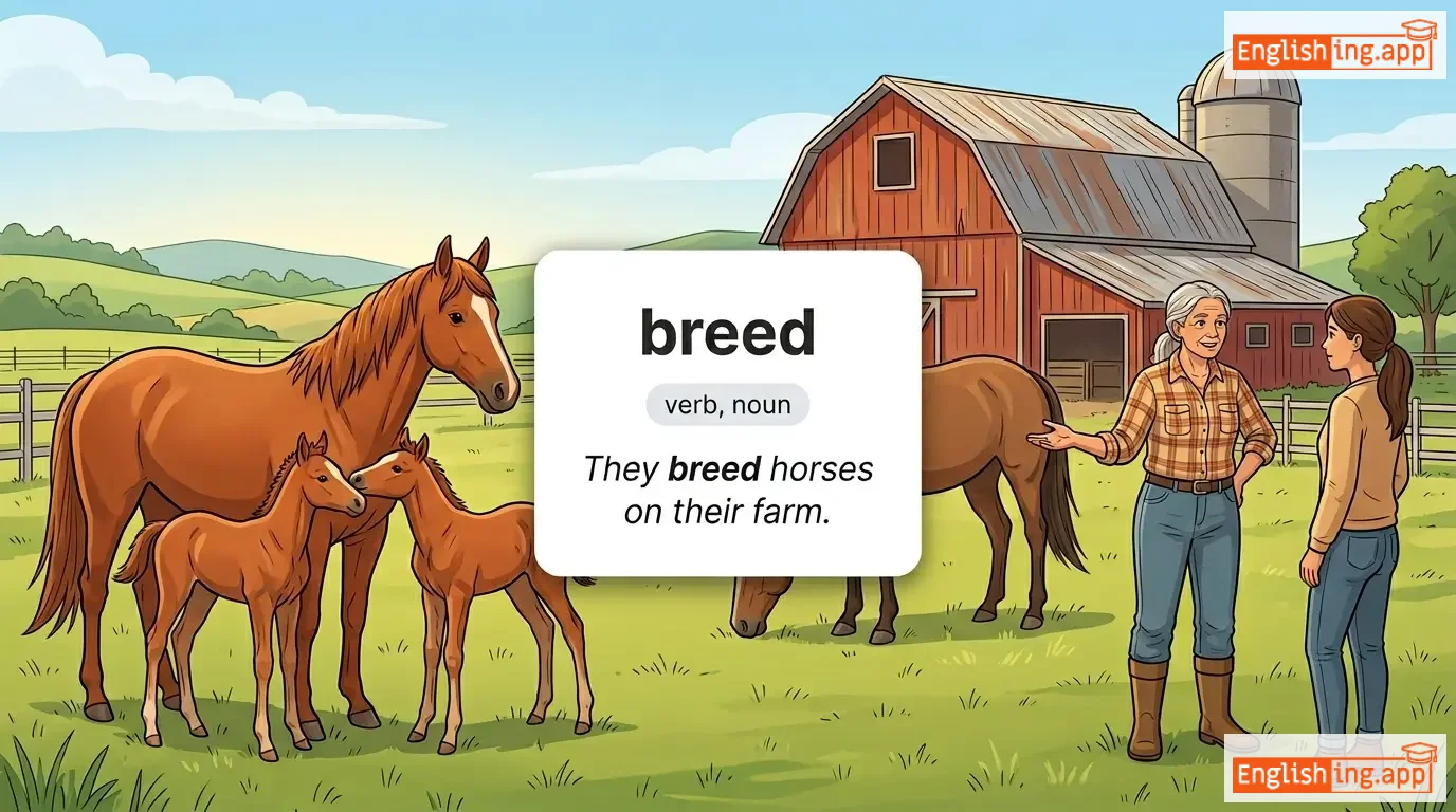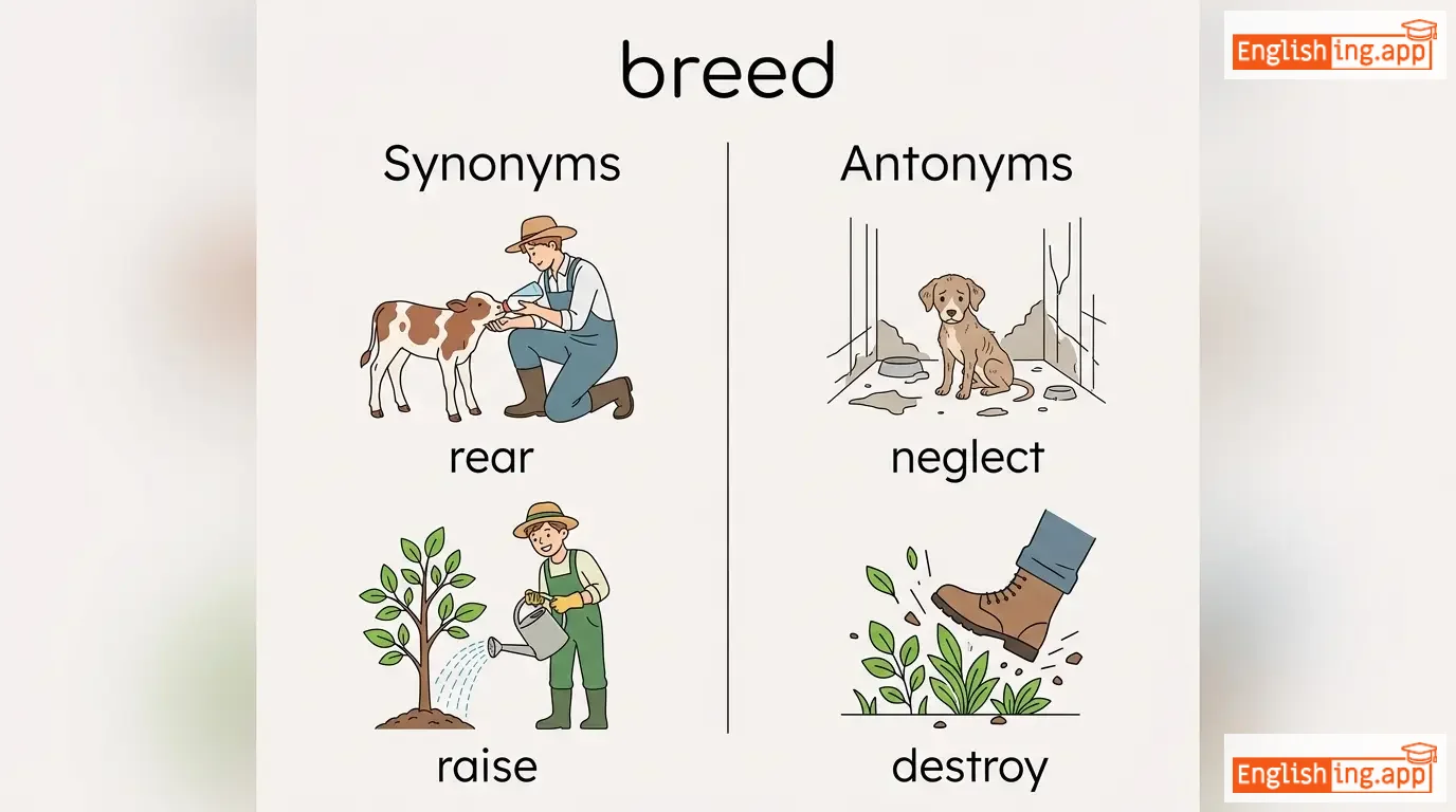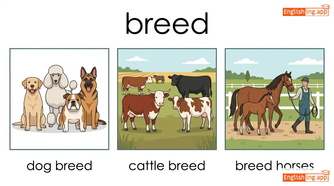 To cause an animal to reproduce; to raise or train; a type or variety of animal or plant.