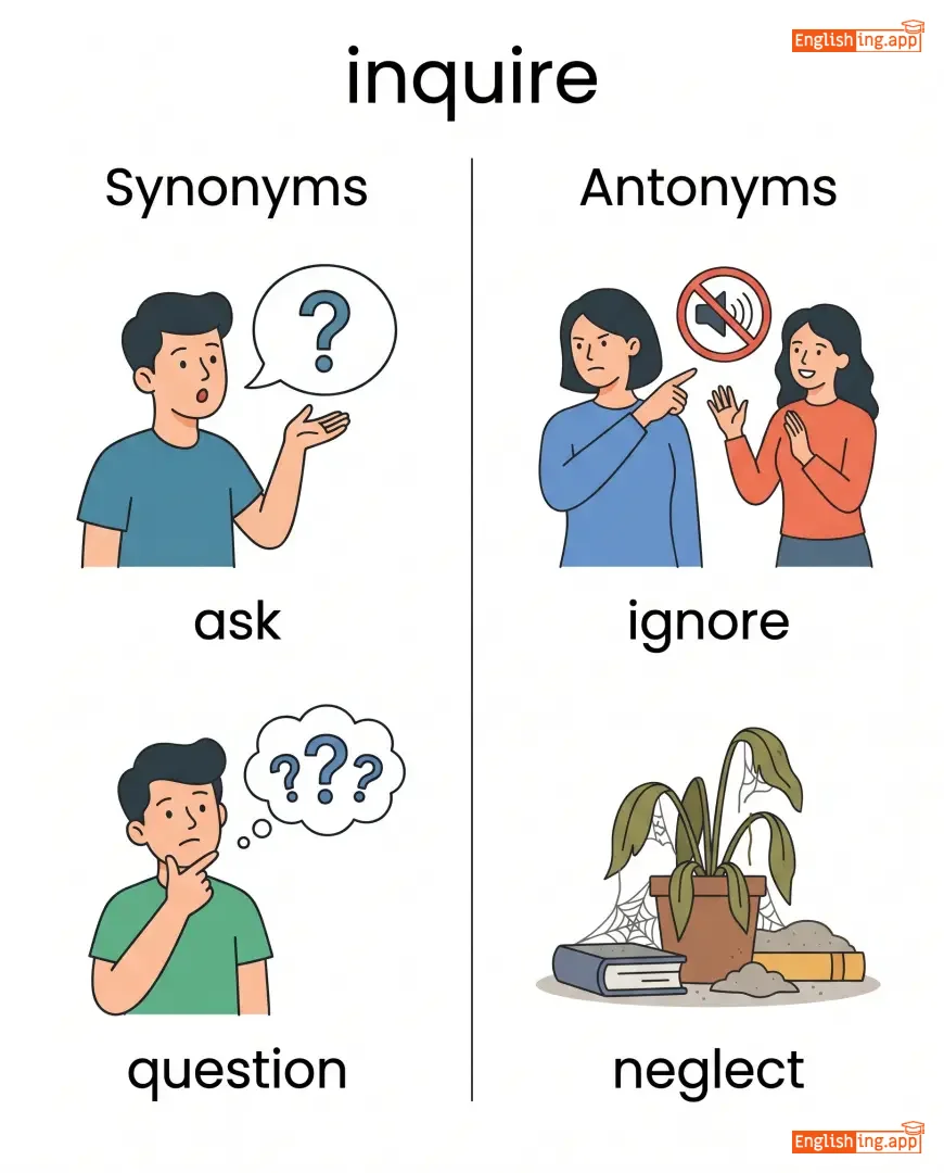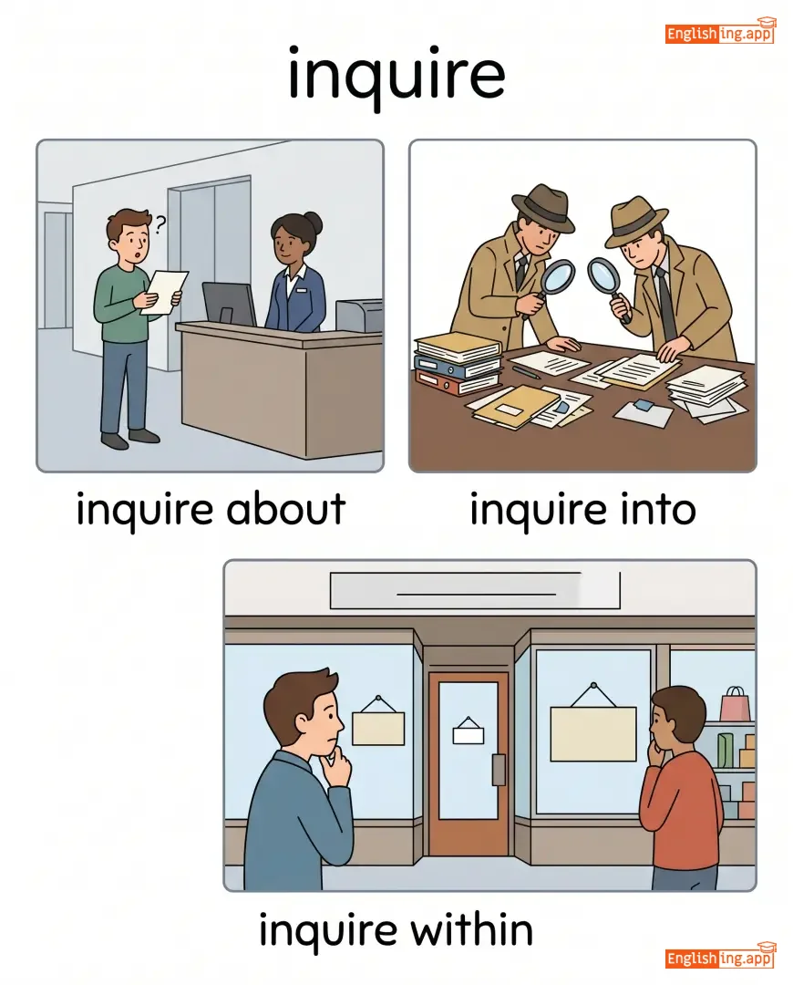 inquire about, inquire into, inquire within, inquire further