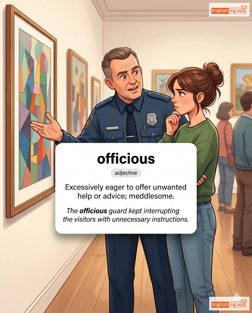 The officious guard kept interrupting the visitors with unnecessary instructions. |
