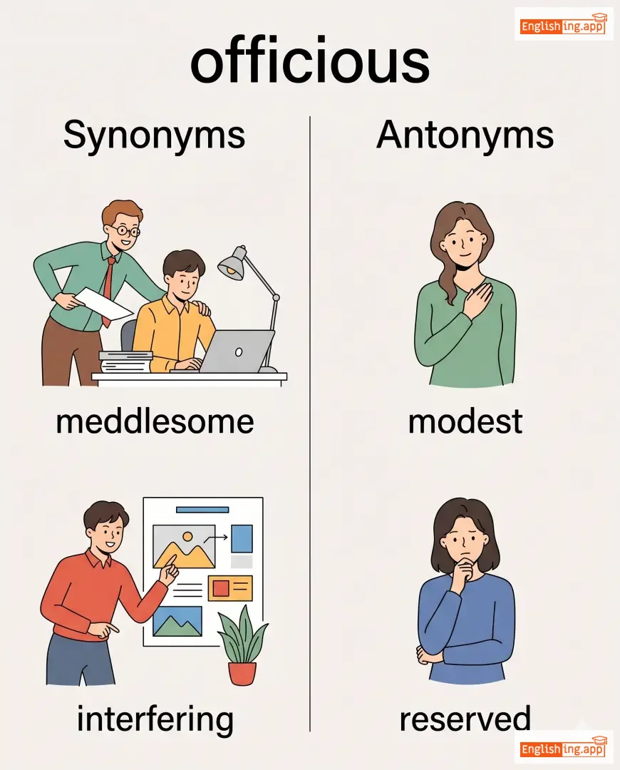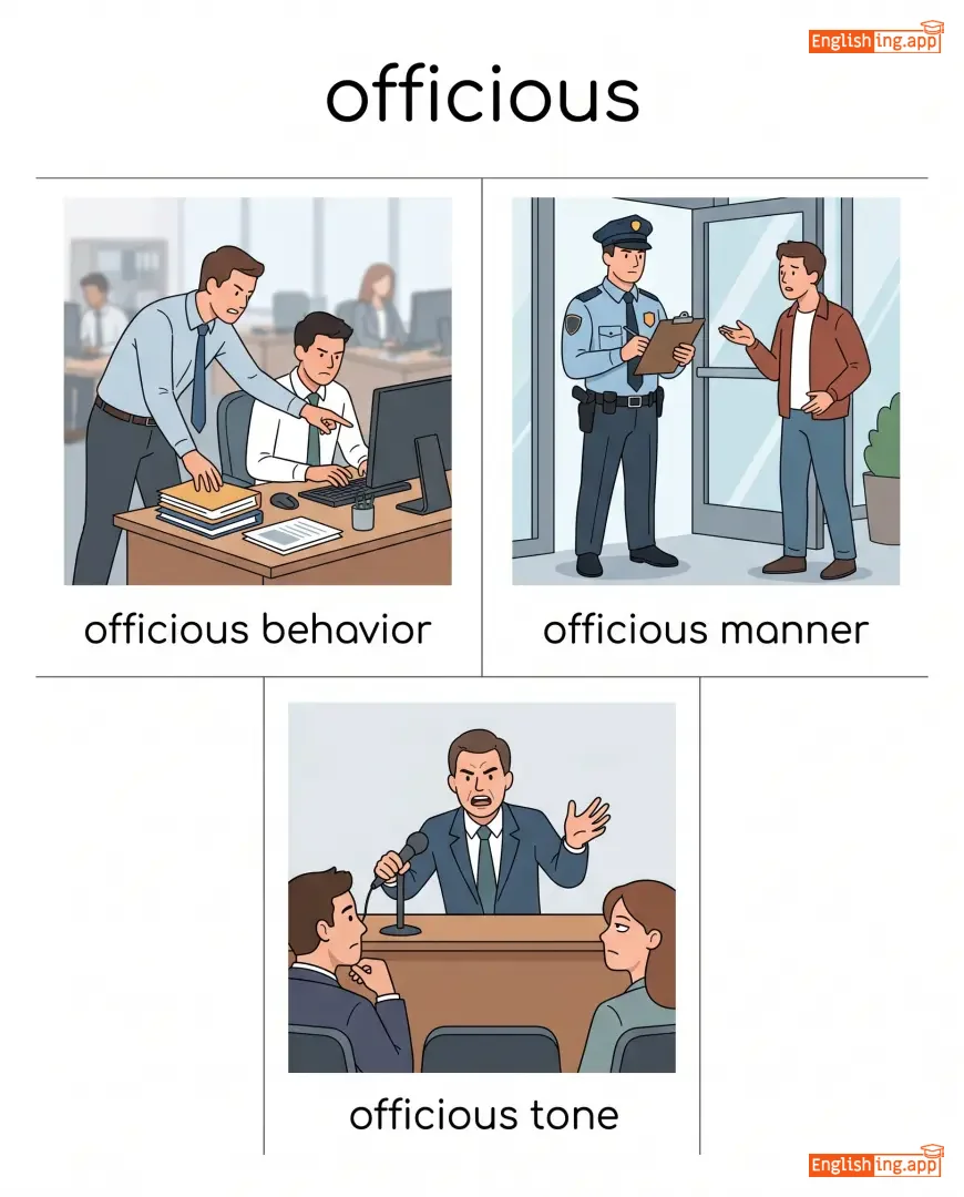 officious behavior, officious manner, officious tone, officious interference