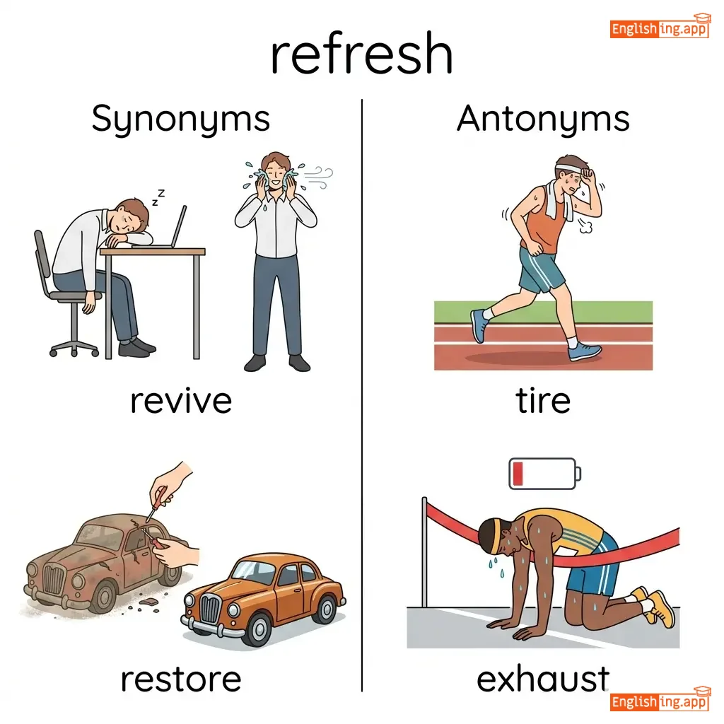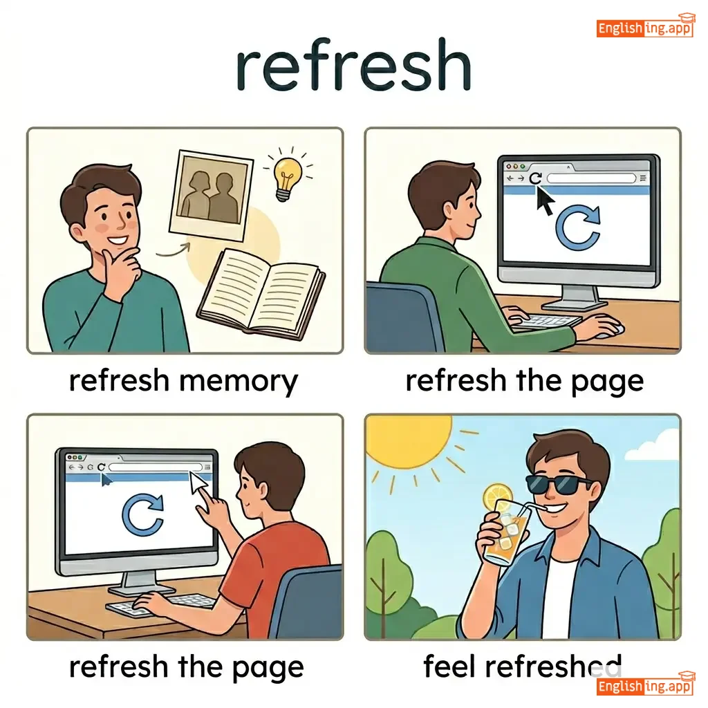 refresh memory, refresh the page, feel refreshed, refreshing drink, refreshing change