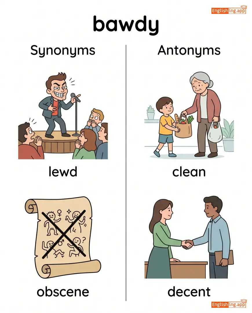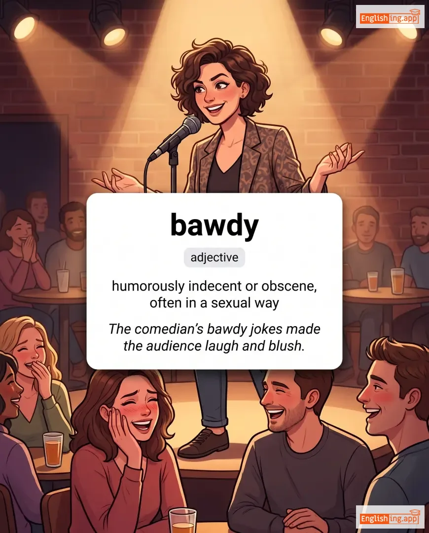 The comedian’s bawdy jokes made the audience laugh and blush. |