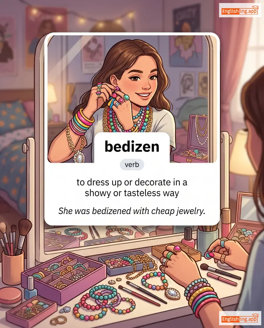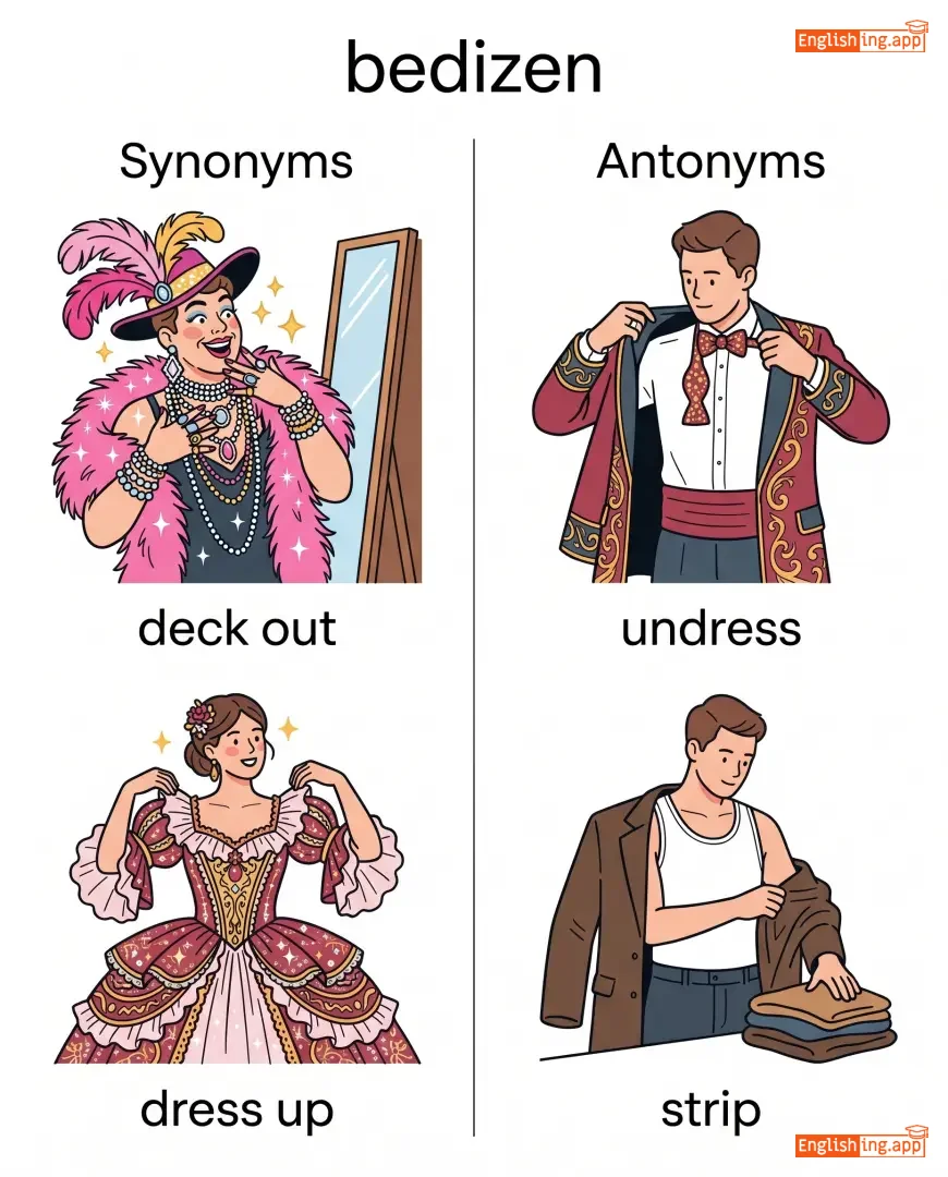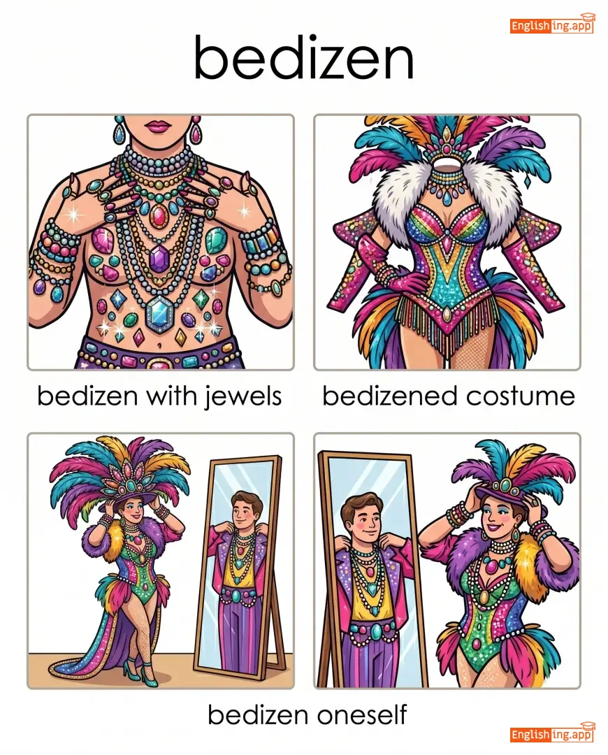 bedizen with jewels, bedizened costume, bedizen oneself
