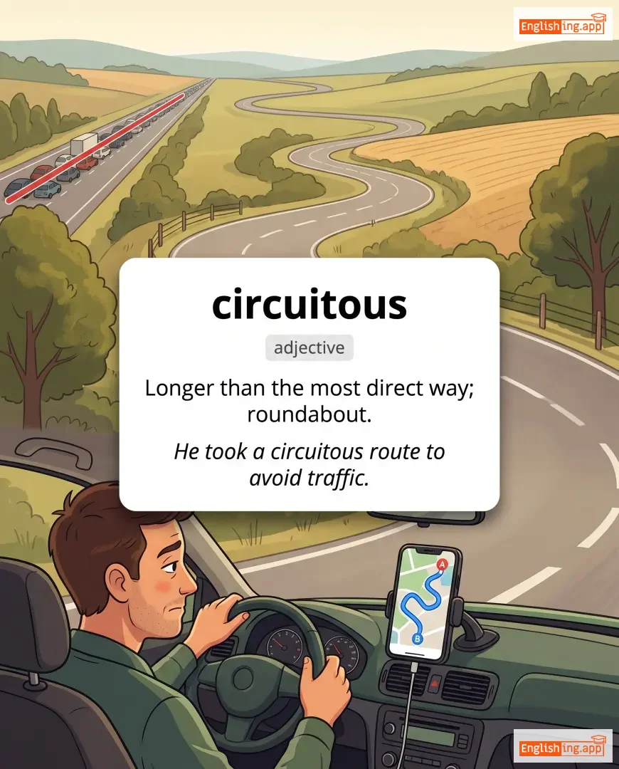He took a circuitous route to avoid traffic. |