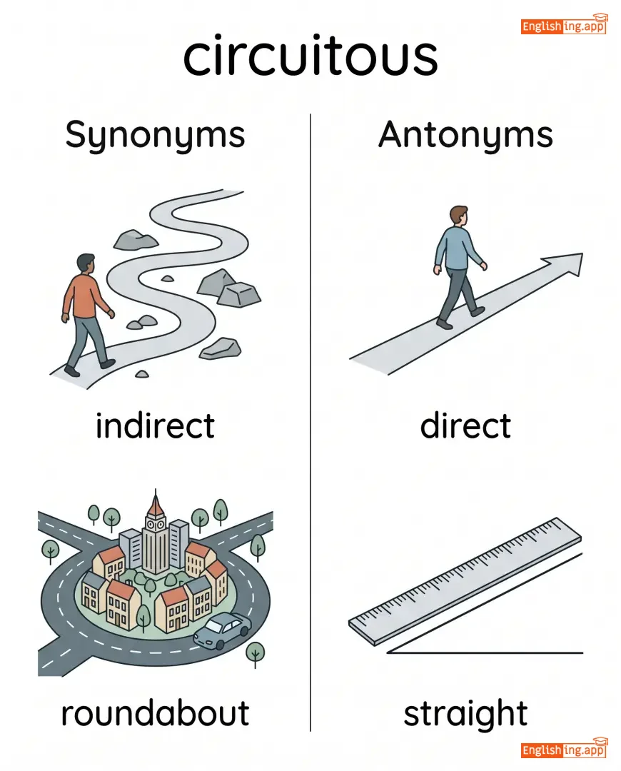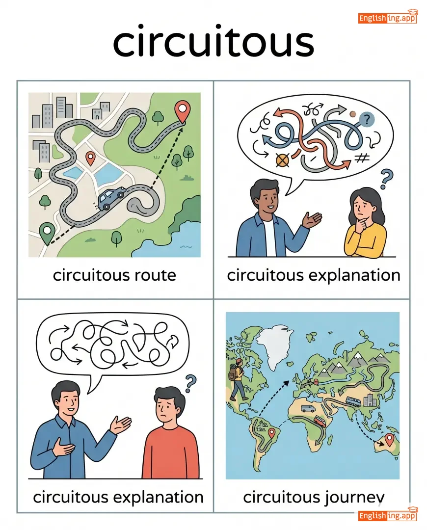 circuitous route, circuitous explanation, circuitous journey