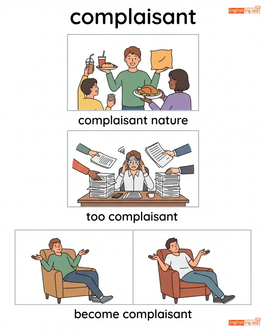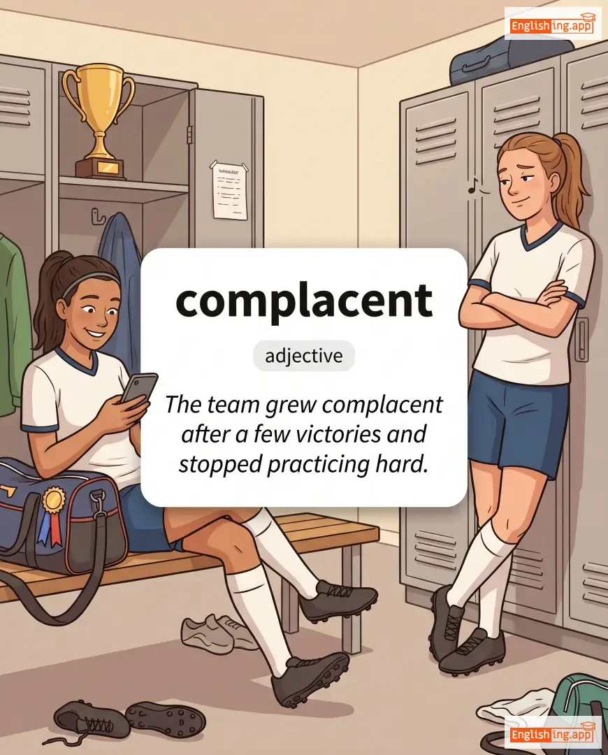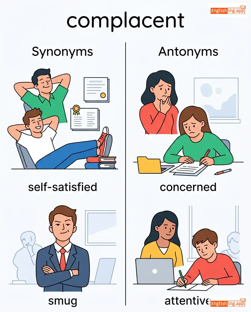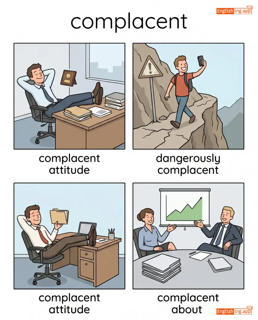 complacent attitude, dangerously complacent, complacent about, complacent in
