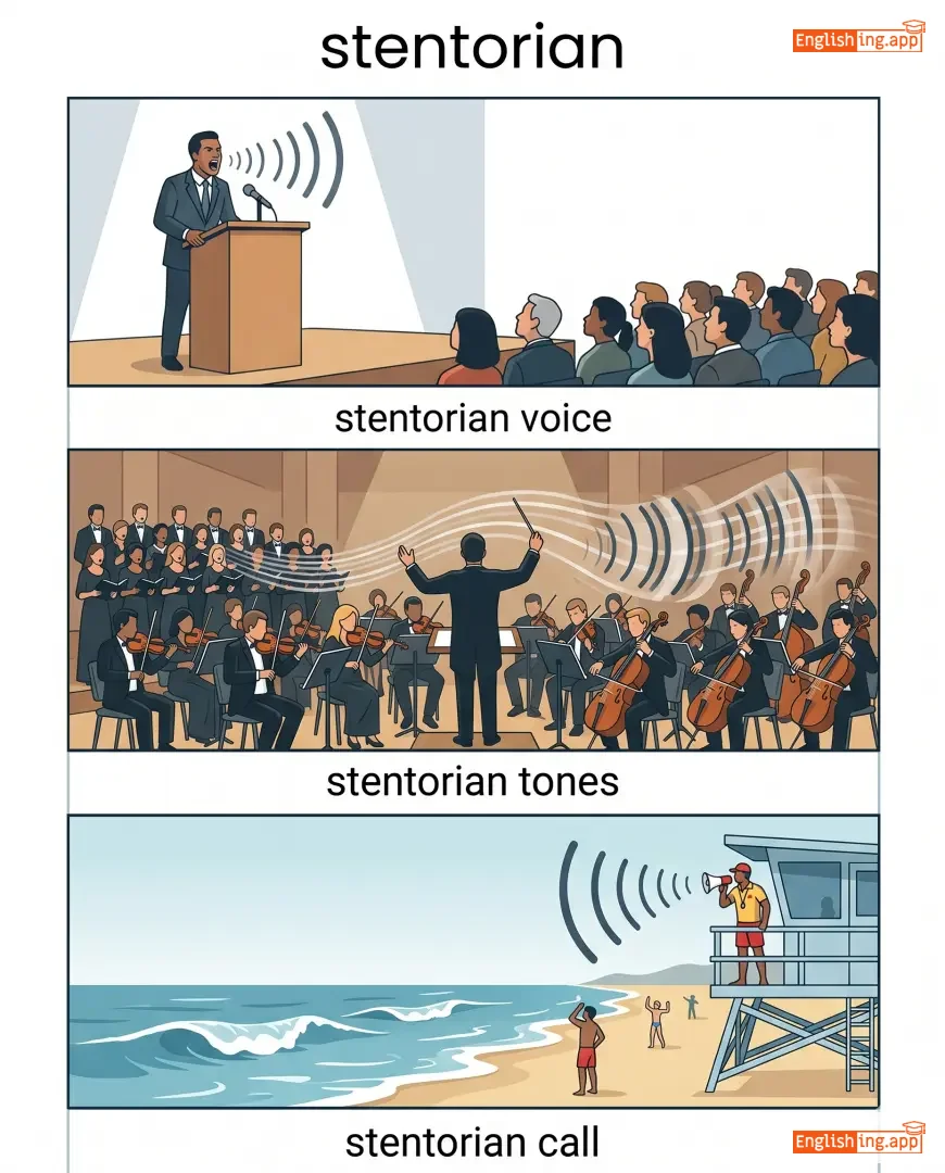 stentorian voice, stentorian tones, stentorian call