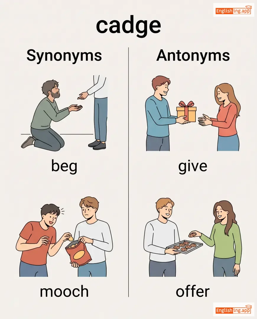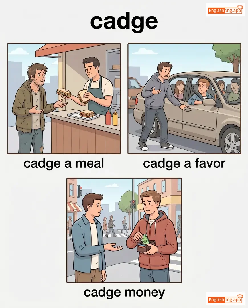 cadge a meal, cadge a favor, cadge money, cadge a ride