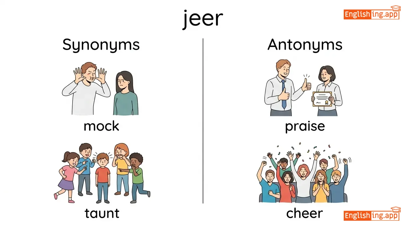 jeer at, jeer loudly, jeer and boo, crowd jeers, jeer mockingly