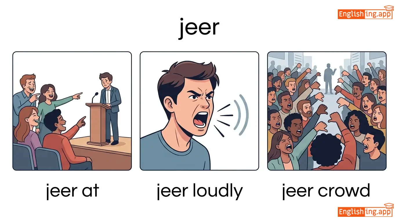 jeer at, jeer loudly, jeer and boo, crowd jeers, jeer mockingly, jeer crowd