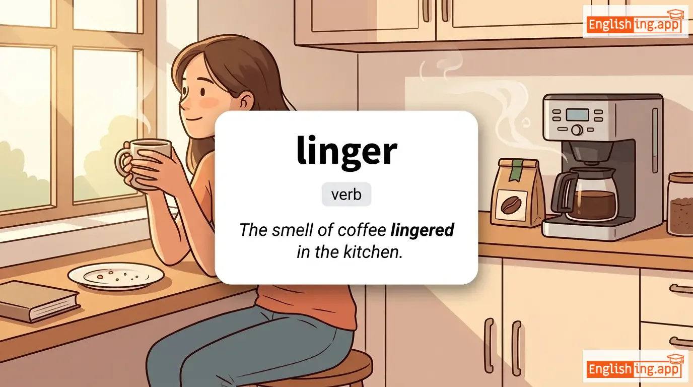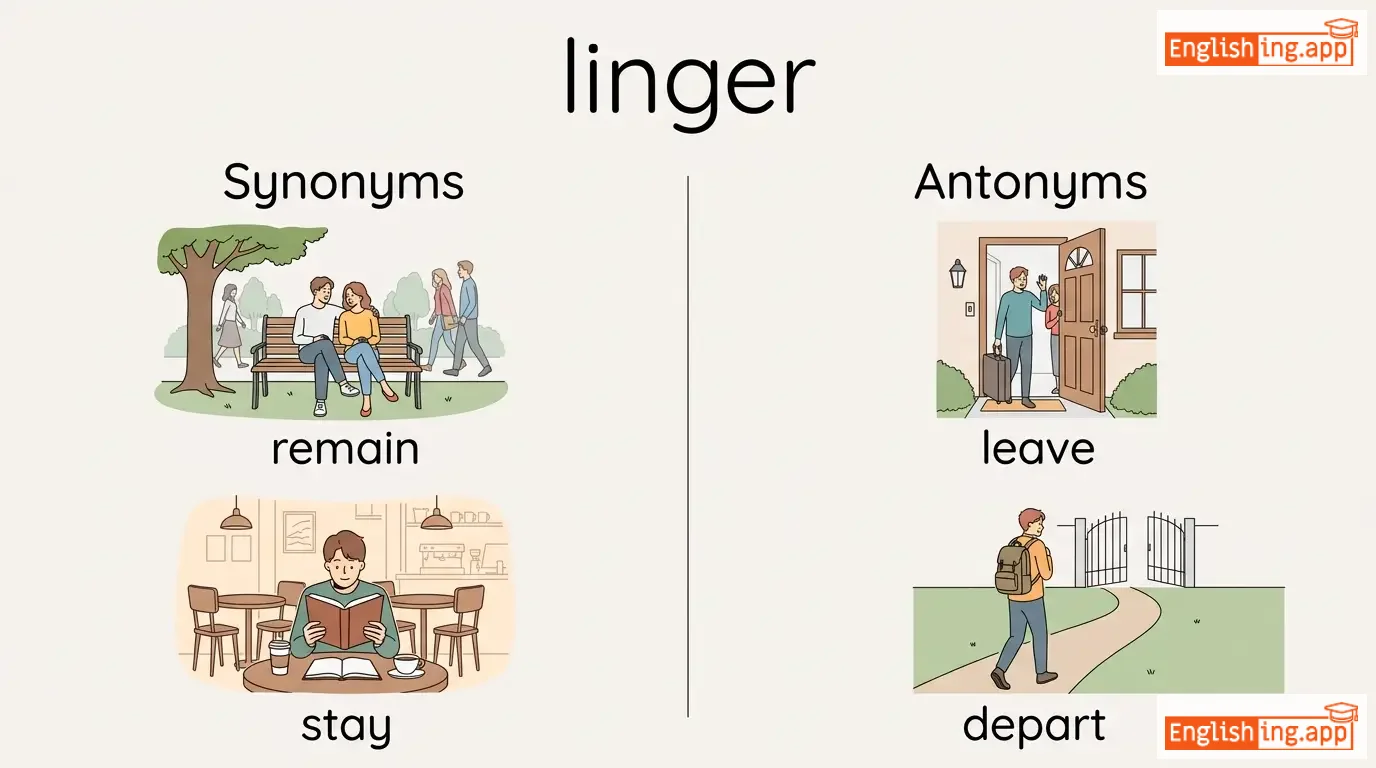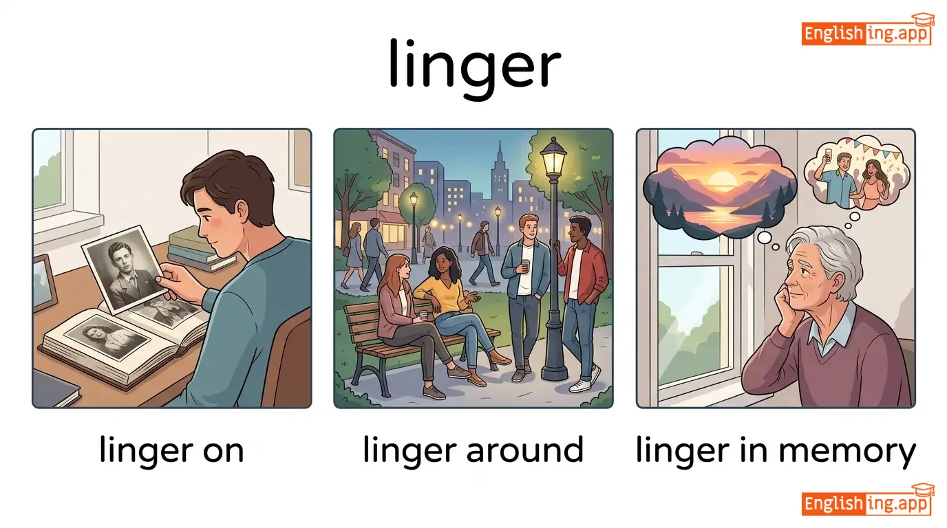 linger on, linger around, linger in memory, linger over, linger longer, linger over dinner, linger doubt